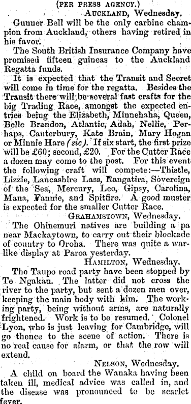 (per press agency.) . Auckland, Wednesday, Gunner Bell will be the only carbine champion from Auckland,--others having retired in his favor. , The South British Insurance Company have promised fifteen guineas to the Auckland Regatta funds. It is expected that the Transit and Secret will come in time for the regatta. Besides the Tranait tliere'will,bo several fast crafts for the big Trading Race, amongst the expected entries being the Elizabeth, Queen, Belle Brandon, Atlantic, Adah, Nellie, Perhaps, Canterbury, Kate Brain, Mary Hogan or Minnie Hare (sio). Tf six start, the first prize will be £6O ; second, £2O. For the Cutter Race a dozen may come to the post. For this event the following craft will compete:—Thistle, Lizzie, Lancashire Lass, Rangatira, Sovereign of the 'Sea, Mercury, Leo, Gipsy, Carolina, Mana, Fannie, and Spitfire. A good muster is expected for the smaller Cutter Race. Grahamsxown, Wednesday. The Ohinemuri natives are building a pa near Mackaytown, to carry out their blockade of country to Oroha. There was quite a warlike display at Paroa yesterday. Hamilton, Wednesday. The Taupo road party have been stopped by Te Ngakau. .The latter did not cross the river to the party, but sent a dozen men over, keeping the main body with him. The working party, ! being without arins, are naturally frightened. Work is to be resumed. ‘, Colonel Lyon, who is just leaving for Cambridge, will go thence to the scene of action. There is no real cause for alarm, or that the row will extend. Nelson, Wednesday, A child on board the Wanaka having been taken ill, medical advice was called in, and the disease was pronounced to be scarlet fever.