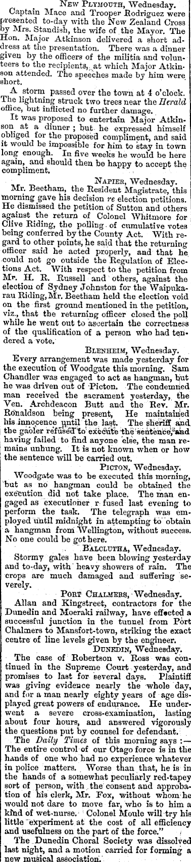 New Plymouth, Wednesday. Captain Mace and Trooper .Rodriguez were presented to-day with the New Zealand Cross by Mrs. Standish, the wife of the Mayor. The Hon. Major Atkinson delivered a short address at the presentation. There was a dinner given by the officers of the militia and volunteers to the recipients, . at which Major Atkinson attended. The speeches made by him were short. A storm passed over the town at 4 o’clock. Tffie lightning struck two trees near the Herald office, but inflicted no further damage* It was proposed to entertain Major Atkinson at a dinner ; but he expressed himself obliged for the proposed compliment, and said it would be impossible for him to stay in town long enough. In five weeks he would be here again, and should then be happy to accept the compliment. ■ Napiek, Wednesday. Mr. Beetham, the Resident Magistrate, this morning gave his decision re election petitions. He dismissed the petition of Sutton and others against the return of Colonel Whitmore for Clive Riding, the polling. of cumulative votes being conferred by the County Act. With regard to other points, he said that the returning officer said he acted properly, and that he •could not go outside the Regulation of Elections Act. With respect to the petition from Mr. H. R. Russell and others, against the election of Sydney Johnston for the Waipukarau Riding, Mr. Beetham held the election void on the first ground mentioned in the petition, viz., that the returning officer closed the poll while he went out to ascertain the correctness of the qualification of a person who had tendered a vote. Blenheim, Wednesday. Every arrangement was made yesterday for the execution of Woodgate this morning. Sam Chandler was engaged to act as hangman, but he was driven out of Picton. The condemned man received the sacrament yesterday, the Yen. Archdeacon Butt and the Rev. Mr. Ronaldson being present, He maintained his innocence qntil the last. The sheriff and. the gaoler having failed to find anyone else, the man remains unhung. It is not known when or how the sentence will be carried out. Picton, Wednesday. Woodgate was to be executed this morning, but as no hangman could be obtained the execution did not take place. The man engaged as executioner r fused last evening to perform the task. The telegraph was employed until midnight in attempting to "obtain a hangman from Wellington, without success. No one could be got here. . Ealclutha, Wednesday. Stormy gales have been blowing yesterday and to-day, with' heavy showers of rain. The crops are much damaged and suffering severely. Poet Chalmehs, 'Wednesday. Allan and Kingstreet, contractors for the Dunedin and Moeraki railway, have effected a successful junction in the tunnel from Port Chalmers to Mansfort-town, striking the exact centre of line levels given by the engineer. Dunedin, Wednesday. The case of Robertson v. Ross was continued in the Supreme Court yesterday, and promises to last for several days. Plaintiff was giving evidence nearly the whole day, and for a man nearly eighty years of age displayed great powers of endurance. He underwent a severe cross-examination, lasting about four hours, and answered vigorously the questions put by counsel for defendant,; The Daily Times of this morning says : The entire control of our Otago force is in the hands of one who had no experience whatever in police matters. Worse than that, he is; in the hands of a somewhat peculiarly red-tapey sort of person, with, the' consent and approbation of his clerk, Mr. Fox, without whom 1 he would not dare to move far, who is to him a kind of wet-nurse,* ' Colonel Moule will try his little 'experiment at the cost of all efficiency and usefulness on the part of the force.” / The .Dunedin Choral Society was dissolved last night, and a motion carried for forming a new muMcal association'.'