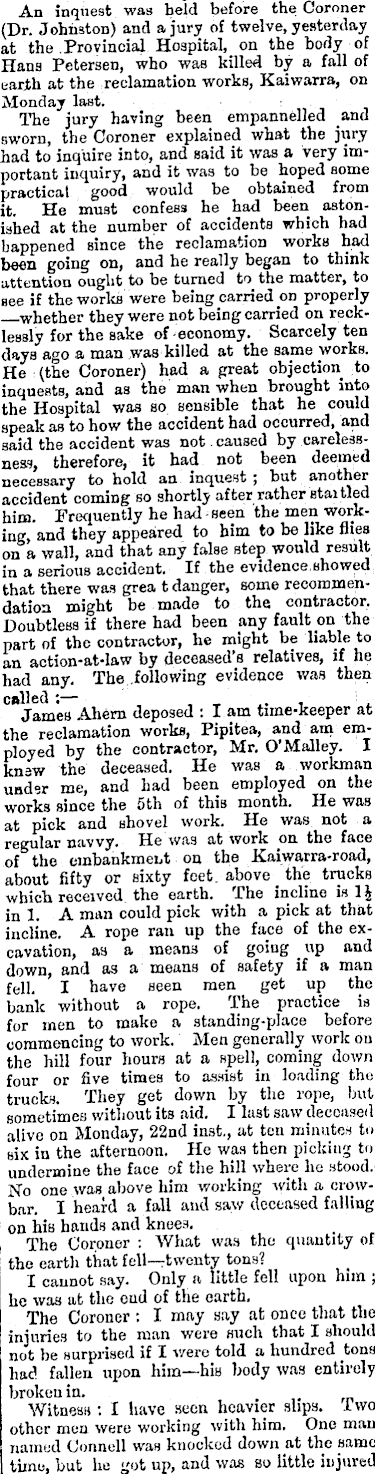 An inquest was held before the Coroner (Dr. Johnston) and a jury of twelve, yesterday at the Provincial Hospital, on the body of Hans Petersen, who was killed by a fall of earth at the reclamation works, Kaiwarra, on Monday last. ■ ■ ; . • The jury having been empannelled and sworn, the Coroner explained what the jury had to inquire into, and said it was a very important inquiry, and it was to be hoped some practical good would be obtained from it. He must confess he had been astonished at the number of accidents which had happened since the reclamation works had been going on, and he really began to think attention ought to be turned to the matter, to see if the works were being carried on properly whether they were not being carried on recklessly for the sake of economy. Scarcely ten days ago a man was killed at the same works. He : (the Coroner) had a great objection to inquests, and as the man when brought into the Hospital was so sensible that he could speak as to how the accident had occurred, and said the accident was not caused by carelessness, therefore, it had not been deemed necessary to hold an inquest; but another accident coming so shortly after rather stai tied him. Frequently he had ■ seen the men working, and they appeared to him to be like flies on a wall, and that any false step would result in a serious accident. If the evidence,showed that there was grea t danger, some recommendation might be made to the contractor. Doubtless if there had been any fault on the part of the contractor, he might be liable to an action-at-law fay deceased’s relatives, if he had any. The,folio wing evidence was then 08 James Ahem deposed : l am time-keeper at the reclamation works, Pipitea, and am employed by the contractor, Mr. O’Malley. I knew the deceased. He was a workman under me, and had been employed on the works since the sth of this month. He was at pick and shovel work. He was not a regular navvy. He was at work on the face of the embankment on the Kaiwarra-road, about fifty or sixty feet, above _ the trucks which received, the earth. The incline is in 1. A man could pick with a pick at that incline. A rope ran up the face of the excavation, as a means of going _ up and down, and as a means of safety if a man fell. I have seen men get up the bank without a rope. The practice is for men to make a standing-place before commencing to work. Men generally work on the hill four hours at a spell, coming down four or five times to assist in loading the trucks. They get down by the rope, but sometimes without its aid. I last saw deceased alive on Monday, 22nd inst,, at ten minutes to six in the afternoon. He was then picking to undermine the face of the hill where he stood. No one was above him working with a crowbar. I heard a fall and saw deceased falling on his hands and knees. The Coroner : What was the quantity of the earth that fell—twenty tons? I cannot say. Only a little fell upon him ; he was at the end of the earth. The Coroner : I may say at once that the injuries to the man were such that I should not be surprised if I were told a hundred tons had fallen upon him—his body was entirely broken in. , rn Witness ; I have seen heavier slips, iwo other men were working with him. One man named Connell was knocked down at the same time, but he got up, and was so little injured