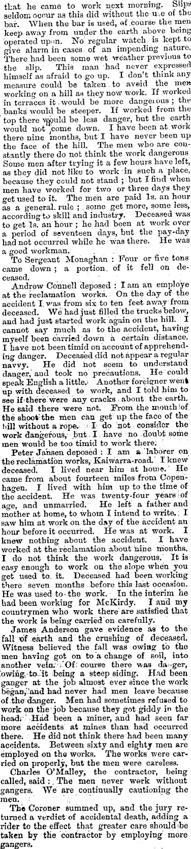 that he came to work next morning. Slips seldom occur as this did without the u ,e of the bar. When the bar is used, of course the men keep away from under the earth above being operated upon. No regular watch is kept-to give alarm in cases of an impending nature. There had been some wet weather previous to the slip. This man had never expressed himself as afraid to go up. I don’t think any measure could be taken to avoid the men working on a hill as they now work. If worked interraces it. would be more dangeious ; the banks would be steeper. If worked from the top there iwjuld be less danger, but the earthwould not come down. I have been at work there nine months, but I have never been up the face of the hill. The men who are constantly there do not think the work dangerous Some men after trying it a few hours have left, as they did hot like to work 'in such a place, because they could not stand ; -hut I find when men have worked for two or three days they get used to it. The men are paid Is. an hour as a general, rule ;. some get more, some less, according to skill and industry. Deceased was to get Is. an hour ; he had been at work over a period of seventeen days, but the pay-day had not occurred while he was there. He was a good workman. . To Sergeant Monaghan : Four or five tons came down; a portion, of it fell on deceased. Andrew Connell deposed : I am an employe at the reclamation works. On the day of the accident I, v-as from six to ten feet away from deceased. We had just filled the trucks below, and had just started work again on the hill._ I cannot say much as to the accident, having myself been carried 'down a certain distance. I have not been timid on account of apprehending danger. Deceased did not appear a regular navvy. He did not seem to understand danger,’and took no precautions. He could speak English a little.' Another foreigner went up with deceased to work, and I told him to see if'there were any cracks , about the earth. He said there were not. From the mouth !of the shoot the men can get up the face of the hill without a rope. >l* do not consider the work dangerous, but- I have no doubt some men would be too timid to work there; Peter Jansen deposed : I am a laborer on the reclamation works, Kaiwarra-road. I knew deceased. I lived near him at home.' He came from about fourteen miles from Copenhagen. I lived with him up to the time of the accident. He was twenty-four years lof age, and unmarried. He left a father and mother at home, to whom I intend to write.; I saw him at work on the day of the accident an hour before it occurred. He was at work. I knew nothing about the accident. I have worked at the reclamation about nine months. I do not think the work dangerous. It is easy enough to work on the slope when you get used to. it. Deceased had been working there seven months before this last occasion. He was used to-the work. In the interim he had been working for McKirdy. l and my countrymen who work there are satisfied that the work is being carried on carefully. James Anderson gave evidence as to the fall of earth and the crushing of deceased. Witness believed the fall was owing to the men having got on to a change of soil, into another vein. Of course there was danger, 'oiving. to .it being a steep siding. Had been ganger at the job almost ever since the work began,-and had never had men leave because ■of-the danger. Men had sometimes refused to work on the job because they got giddy in the headr ’ Had been a miner, and had seen far more accidents at mines than had occurred there. - He did not think there had been many accidents. Between sixty and eighty men are employed on the works. The works were carried on properly, but the men were careless. Charles O’Malley, the contractor, being called, said The men never work without gangers. We are continually cautioning the men. The Coroner summed up, and the jury returned a verdict of accidental death, adding a rider to the effect that greater care should jbe taken by the contractor by employing' more gangers.