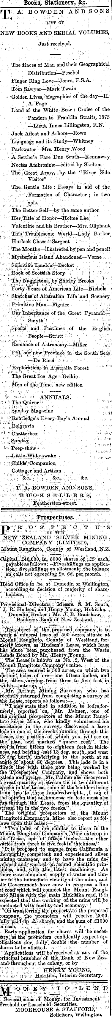 Books. Stationery. &,c. . \i. a; bowden- "a n d so n s .:'#■ .;■■-.. ■', :■'■> '■ i"t ■• ' '■• ! j ■ ' :.:.•: ... v:WBT OJP ' NEW BOOKS AND SERIAL VOLUMES, > -:-■.. Just received. The Races of Man and their Geographical , Distribution—Pesehel Finger Ring Love—Jones, F.S.A. Tom Sawyer—Mark Twain ' Golden Lives, biographies of theiday—H. ' '/ .A.'Page ~,',., , . | Land of the White. Bear : Cruise of the ~■■■■ Pandora to Franklin Straits, 1875 . .' Jack Afloat and Ashore—Rowe Language and its Stud; —Whitney ■• Parkwater—Mrs. Henry .Wood A Settler's Fare Due South—Kennaway Noctes AmbrosinK—edited by Skelton iThe iGreat Army, by the "River Side ■..' ?; Visitor" '■' .' ; ' r ' ; \ ■ The. Gentle Life : Essays' in aid of the .. .Formation of• Character ; in two .. The Better Self—by the same author HerTitle.of Honor—Holme iieej '" ' " Valentine andhis Brother—Mrs. Oliphant; 1 This' Troublesome World—Lady Barker, Tlie Months—illustrated by pen t and pencil ,'-■ '. Sfysterjous. Island Abandoned—Verne , " '" l Scientific -,j ü ßook of Scottish Story ■;■'.•< • !'> | ' ■■'■■■'<■■■■ ,:, . Forty Years of American Life—Nichols '-' " Sketched of Australian Life '.and Scenery' . ■!Primitive.Man—Figiiier ; ' ' "' ..''.Our Inheritance of the Great Pyramid-r- ---■.•::■' A -V. Smyth*-' •} ' ! • ! ■;■■> ';-;;•': ■ /Sports and Pastimes of the English, >■:■•"■' '■■■> People—Strutt '-' " , '' ; - : '"■■■:-■* , ■Romance' of. Astronomy— Miller : ' iV„\ ; : Fiji, Province in ■ the South'Seas' —De Ricci•..:■,■ > ' ' ' ; ''EJsrplorationfi in,Australia Forest - • '- .The Great Ice Age—Geikie ',,', Men of the;Time, new edition : U> •i.-.'Ll si ANNUALS. • , '' t (i-The-'Quiver-J '■[ "■ "'-'^ V w §un<lay Magazine • j V t ji i ' "Rotitledge's Every-Boy's Annual ."■>" ■ t , L Belgravia •■"'.' 'i "Chatterbox ''- : ' .' ■>• '■■-' hi!) l'..i.:v ■■.■■: ..■'•.■.■ .. •, ji-ii •„ , ~,, .-.".'■. J'- 1 Peep-sib W ; ■- '..'..','..'• „-Jjittle.Wide-awake - : ,- ~ ; ., : ;f N Ghilds';Companion.....' , ••'.•.'.; &<-••','■'.'.! ..,&C.,,. ;:,,...; &C. Y\;^;T'^io^DEN'-ANDiSONS,:! : ~• :.-'■.\-,i -R'al ■"-' "■ ~,"-,' ■'■] Featherston-street. 0 ,•. i "',•„ ~n '■'• ' ! ; ! Vf ,' \ j;; '--.• i J ;B; ! ,.t)/ : s ; '.,,p: ! '' , E;'"'c,;' r T : U---S-L ;t - "*'"i '*".'■'■' "-''.'bp'THß';' :l '. '', ; ''"',, NEW :: ZEALAND ! STLVER MINING , ; '";';'' / ' ; pOMPANY (LIMITED), j ;•'";'.;' ' of ;Wsstlaad,.N-Z----ifollows: —Fiveshillings oniapplica- ■ tioh;.£ve; shillings on allotment-,the balance ] ,on balls not'exceeiiing-Ss. 6d. per, month. . ,' Head'Office'to'be' at Dunedin or; Wellington, .'ajjcofding to'decision of majority of sharel,.'holde'rsl( _'; ,';, ":., t .-; i-A-- ' ■'■'.■• n. iPrbvisionalr Directors : Messrs. S. M; Soufh,^ ' J ( . Bl' Young,'Hokitika.,.,, Broker: Mr. J..B.,Bradshaw,.,, ~, ' '.',,•'. " 'I ,Tjhe[object tfii»,'proposed „copipany lis tq.fwbrk a'jmineiial Jeaso .of .500 >4oresj,situate at. M<?unt .'County/of Westlandi for-,.., knpjwn,' as ''Hudson's';" Lease, which lease hiis'>mce b'een,,'purcKased;. from the 'jVaste, Lands Board Jby \ ~ '.' The Lease is. known,' as' No. , 2/ West of the 1 , • ' .The area secured is.SQO acres,;on |which two, distinct" lod^s]; of' pre—one .fifteen „in,chesj and |h,e.-, btlier.yVary^g^from'" three to, .fiye| feet. in. ■ ;'"i\ '',', .'.',:; :"•'.,.'-. \ ,"■ '„■. riCft.'.''A¥+lmiS-' j -Mining RnrvpffftP, lian recently ,frbm completipg. a survey pf tji'e a?jfollows:—,, ; ■, '. j !.. stotethat in addition; to'.lbdes for-' jniferl;. Reported!''on, Palmer,, (one . of tiie original prpspe,ctpra of the, Rangitoto v Silver; Mine,; who kindly volunteered his assistance .in dispoyerbd a large, of r t]h'ejc'reeks,i^rining ; through this, the', plan, aii[d, "quartz, reef j"., The re|ef';ie(lE'rbm' fifteen to,i' eighteen ifeet/.in thick-' nep, i west. tS | d^%pMp J an angfe\bf'a|)o^t' r SP. 'degrees, is in a .Company,.and > shows, both faienS>nd'pyrii(;eß^ ; |Mr v Palmer also ilisfcoyered c^^''in't^y^ease)'9o^e' , I f^o^' ( 'tfiree .hundredweight.,, ,1 aiq of j the opinion that an, immense tin lode must also ''The' 'bnginal' prospectors of'. ( "'se JMjount'l Lapgitoto.Company!s„ Mice also r'eporj; as fol- I 'fount Rangitotb ppmpa^y's^Mine'ou^crop: Kis'Lease, opb' of" .fifteen 'other riiMfiß from three to';five'feefcin''ttickness." ,"I#s''tii!js/>f(e.4 ,;tcj. engage :ffQtt> California a hprougßlyjicompetent, and experienced silver, Qiuing arid 'to have the' mine der,elo^d"(ukd<' Wtjrked ■ ovi. Vipiind;scientific prinsjplfiji' j'an^l'.^tjti,,,'|h'ej latest, machinery. As. there is.an abundant supply of water and timber in the immediate vicinity of the mine, and bhe Government, have now in progress a line sf road the Mount RangiWfc9'^lin^B.jjr4th;tHe /inainiHokitika road, it is sxpecteci .that the> working of the mine will be oon'ducted with facility and j ~.'"' '.. the piroperty.to; the proposed promoters will reqeive, 2,000; fully'.mid-up i ßhare v ßi''and the'sumof £loOO' in"cash.,'■',',■,,,',.; f..,;'•!:,■?'' .< -•.■■•". i ■■ h '; ■ ; . ■, | , Early application for .shares will be necesiary,' as thfe "prbm6t'erS ; confidently ;expect applipatibnsVifpr.'^fully,,double ;the number of, mares tobe allotted. ~ " ■ •■>■■■■ • ■':'•' Applications will be'received at any of the. principal "branches of the.;Bank ,of New Zealand* throughout, the, colony* or by ; HENRYi YfttTNG, . : ; ,;■■• in'; l-Iw-.t Hokitika, Interim'SeCretary. , ■uq- !N«<E;"Y- ■'■■■ T'l o\y- L-E 'N; 'D qf Money j for.lnvestment'; ' freehold or'Leasehold Securities. ■•' , MOORHOUSE & STAFFORD,Solicitors, Wellington.