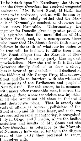 In Its attack Upon nis Excellency the Governor the Otago Guardian has received congenial assistance. Mr. Robert Stout, M.H.E., has come to its assistance, and, as will be seen by a telegram, has quietly settled that the Marquis of Normanby's conduct as Governor has been most blameable. Unfortunately the member for Dnnedin gives no greater proof of his assertion than the mere dictum of Mr. Eobert Stout, and, as a consequence, 'those who know that Mr. Stout's fervid faith always believes in the truth of whatever he wishes to be true will be inclined to differ from him. Mr. Stout alleges that tha Marquis of Normanby showed a strong party bias against provincialism. Now the real truth is that the Governor simply declined to show a strong bias in favor of provincialism, and declined at the bidding of Sir George Grey, Macandrew, Stout, and Co. to interfere with the wishes of the-majority of the Parliament and people'of NewZealaud. For this reason, lie in common with many other reasonable men, incurred the dislike of those whose fanaticism saw injustice in all who would not aid them in their wild and destructive plans. That is exactly the state of affairs.as between, politicians of the Stout stamp and his Kxcellency, and such, we are assured on excellent authority, is recognised fully in Otago and Dunedin, where the foolish assertions and insults of Mr. Stout and the Otago Guardian in reference to the Marquis of Normanby have earned for them the disgust even of the party they professed to range themselves with.