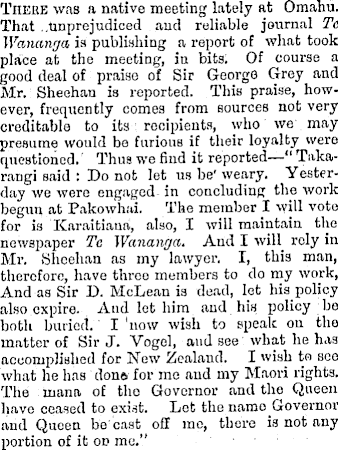 TnERE was a native meeting lately at Omahu. That ..Unprejudiced and reliable journal Tc Wananga is publishing a report of what took place at the meeting, in bits. Of course a good deal of praise of Sir George Grey and Mr. Sheehan is reported. This praise, however, frequently comes from sources not very creditable to its: recipients, who we may presume would be furious if their loyalty were questioned.' Thus we find it reported—" Takarangi said :Do not let us be' weary. Yesterday we were engaged in concluding the work begun at Pakowhai. The member I will vote for is Karaitiana, also, I will maintain the newspaper Tc Wananga. And I will rely in Mr. Sheehan as my lawyer. I, this man, therefore, have three members to do my work, And as Sir D. McLean is dead, let his policy also expire. And let him and his policy be both buried. I 'now wish to speak on the matter of Sir J. Vogel, and see what he has accomplished for New Zealand. I wish to see what he has dona for me and my Maori rights. The uiana of the Governor and the Queen have ceased to exist. Let the name Governor and Queen be'east off mo, there is not any portion of it or> me."