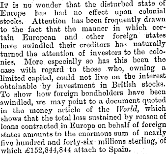 It is no wonder that the disturbed state of Europe has had no effect upon colonial stocks. Attention has been frequently drawn to the fact that the manner in which certain European and other foreign Btates have swindled their creditors ha< naturally turned the attention of investors to the colonies. More especially so has this been the case with regard to those who, owning a limited capital, could not livo on the interest obtainable by investment in British stocks. To show how foreign bondholders have been swindled, we may point to a document quoted in tho money article of the World, which shows that the total loss sustained by reason of loans contracted in Europe on behalf of foreign states amounts to the enormous sum of nearly five hundred and forty-six- millions Bterling, of which £152,844,844 attach to Spain.