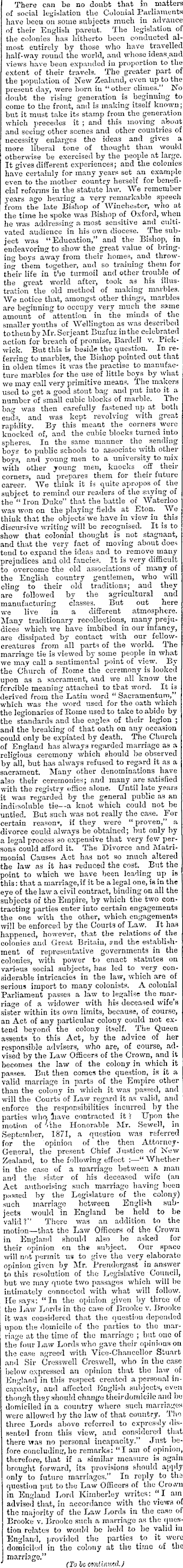 There can be no doubt that in matters of social legislation the Colonial Parliaments have been on some subjects much iu advance of their English parent. The legislation of the colonies has hitherto been conducted almost entirely by those who have travelled half-way round the world, and whose ideas and views have been expanded iu proportion to the extent of their travels. The greater part of the population of New Zealand, even up to the present day, were born in “other climes.” No doubt the rising generation is beginning to come to the front, and is making itself known; but it must take its stamp from the generation which precedes it ; and this moving about and seeing other scenes and other countries of necessity enlarges the ideas and gives a more liberal tone of thought than would otherwise he exercised by the people at large. It gives different experiences; and the colonies have certainly for many years set an example even to the mother country herself for beneficial reforms iu the statute law. We remember years ago hearing a very remarkable speech from the late Bishop of Winchester, who at the time he spoke was Bishop of Oxford, when he was addressing a most sensitive and cultivated audience in his own diocese. The subject was “Education,” and the Bishop, in endeavoring to show the great value of bringing hoys away from their homes, and throwing them together, and so training them for their life in the turmoil and other trouble of the great world after, took as his illustration the old method of making marbles. We notice that, amongst other things, marbles are beginning to occupy very much the same amount of attention in the minds of the smaller youths of Wellington as was described to them by Mr. Serjeant Buzfuz in the celebrated action for breach of promise, Bardell v. Pickwick. But this is beside the question. In referring to marbles, the Bishop pointed out that in olden times it was the practise to manufacture marbles for the use of little boys by what we may call very primitive means. The makers used to get a good stout bag and put into it a number of small cubic blocks of marble. Ihe hag was then carefully fastened up at both ends, and was kept revolving with great rapidity. By this meant the corners were knocked of, and the cubic blocks turned into spheres. In the same manner the sending boys to public schools to associate with other boys, and young men to a university to mix with other young men, knocks off their corners, aud prepares them for their future career. We think it is quite apropos of the subject to remind our readers of the saying of the “ Iron Duke” that the battle of Waterloo was won on the playing fields at Eton. We think that the objects'we have iu view in this discursive writing will be recognised. It is to show that colonial thought is not stagnant, and that the very fact of moving about does tend to expand the ideas and to remove many prejudices and old fancies. It is very difficult to overcome the old associations of many of the English country gentlemen, who will cling to their old traditions; aud they are followed by the agricultural and manufacturing classes. But out here we live in a different atmosphere. Many traditionary recollections, many prejudices which we have imbibed iu our infancy, are dissipated by contact with our fellowcreatures from all parts of the world. The marriage tie is viewed by some people in what we may call a. sentimental point of view. By the Church of Eome the ceremony is looked upon as a sacrament, aud we all know the forcible meaning attached to that word. It is derived from the Latin word “ Sacra men turn,” which was the word used for the oath which the legionaries of Borne used to take to abide by the standards and the eagles of their legion ; and the breaking of that oath on any occasion could only be expiated by death. The Church of England has always regarded marriage as a religious ceremony which should be observed by all, but has always refused to regard it as a sacrament. Many other denominations have also their ceremonies; and many are satisfied with the registry office alone. Until late years it was regarded by the general public as an indissoluble tie—a knot which could not be untied. But such was not really the case. For certain reasons, if they were “ proven,” a divorce could always be obtained; but only by a legal process so expensive that very few persons could afford it. The Divorce and Matrimonial Causes Act has not so much altered the law as it has reduced the cost. But the point to which we have been leading up is this: that a marriage, if it be a legal one, is in the eye of the law a civil contract, binding on all the subjects of the Empire, by which the two contracting parties enter into certain engagements the one with the other, which engagements will be enforced by the Courts of Law. It has happened, however, that the relations of the colonies aud Great Britain, and the establishment of representative governments in the colonies, with power to enact statutes on various social subjects, has led to very considerable intricacies in the law, which are of serious import to many colonists. A colonial Parliament passes a law to legalise the marriage of a widower with his deceased wife’s sister within its own limits, because, of course, an Act of any particular colony could not extend beyond the colony itself. The Queen assents to this Act, by the advice of her responsible advisers, who are, of course, advised by the Law Officers of the Crown, and it becomes the law of the colony in which it passes. But then comes the question, is it a valid marriage in parts of the Empire other than the colony in which it was passed, and will the Courts of Law regard it as valid, and enforce the responsibilities incurred by the parties who have contracted it '! Upon the motion of 'the Honorable Mr. Sewell, in September, 1871, a question was referred for the opinion of the then AttorneyGeneral, the prese