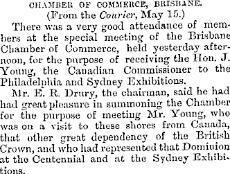 CHAMBER OP COMMERCE, BRISBANE. (From the Courier , May 15.) There was a very good attendance of members at the special meeting of the Brisbane Chamber of Commerce, held yesterday afternoon, for the purpose of receiving the Hon. J, Young, the Canadian Commissioner to the Philadelphia and Sydney Exhibitions. Mr. E. B. Drury, the chairman, said he had had great pleasure in summoning the Chamber for the purpose of meeting Mr. Young, who was on a visit to these shores from Canada, that other great dependency of the British Crown, aud who had represented that Dominion at the Centennial and at the Sydney Exhibitions.