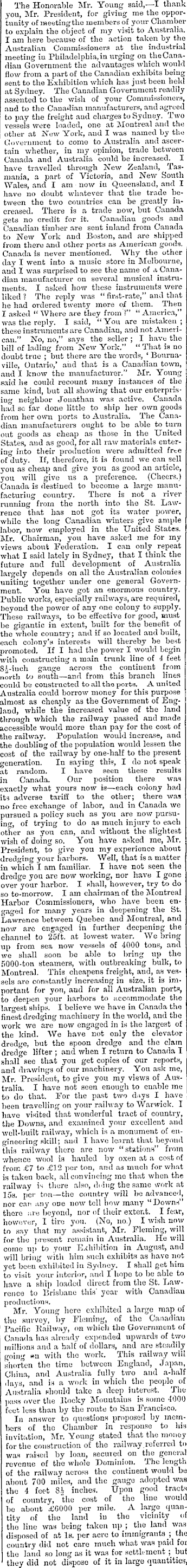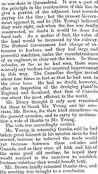 as was done in Queensland. It was a part of the principle in the construction, of this line to "ive a portion'of the adjacent land towards paying for the line ; but the present Government opposed it, and he (Mr. Young) believed they were right, and when the line was finally constructed, no doubt it would be done for hard cash. As a matter of fact, the value of the land would be increased by the railway. The Federal Government had charge of entrances to harbors, and they had large and powerful machines, under the superintendence of an engineer, to clear out the bars. Iu these colonies, as far as he had seen, there were scarcely any harbors but required improvement in this way. The Canadian dredges moved about four times as fast as that he had seen in the river here. He had no doubt, however, after an inspection of the dredging plant/iu England and Scotland, that of Canada was about the most efficient in the world. Mr. Drury thought it only now remained for them to thank Mr. Young and his associate, Mr. Brown, for their kind attendance on the present occasion, and to carry by acclamation a vote of thanks to Mr, Young. The vote was accordingly carried. Mr. Young, in returning thanks, said he had taken"great interest in his mission since he had started, because he believed the trade would yet increase between these colonies and Canada, and as they were all kith aud kiu of the same good old mother, he hoped they would succeed in the endeavor to establish business relations that would benefit both. Mr. Brown briefly returned thanks also, and the meeting was brought to a conclusion.