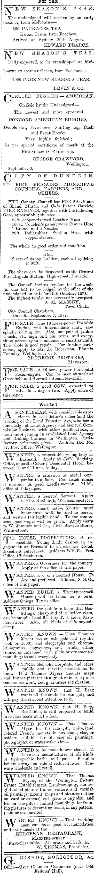For Sale N EW SEASON’S TEAS, The undersigned will receive by an early steamer, from Melbourne—--850 PACKAGES TEA Ex s.s. Ocean, from Eoochow, Arrived at Sydney 29th August. EDWARD PEARCE. SEASON’S TEAS! Daily expected, to be transhipped at Melbourne ex steamer Ocean, from Eoochow—--1000 PKGS NEW SEASON’S TEAS. LEVIN & CO. OONCORD BUGGIES AMERICAN. On Sale by the Undersigned— The newest and most approved CONCORD AMERICAN BUGGIES, Double-seat, Five-bows, Shifting top, Back and Front Breaks, Very highly finished; As per special certificate of merit at the Philadelphia Exhibition. GEORGE CRAWFORD, Wellington. September 8. |OI TV OF DUNEDIN. TO FIRE BRIGADES. MUNICIPAL COUNCILS, FARMERS, AND OTHERS. THE County Council has FOR SALE on© of Shand, Mason, and Co.’s Patent Curricle FIRE ENGINES, together with the following Gear, appertaining thereto;— 80ft. copper-rivetted Leather Hose 100 ft. Voucher’s patent wove Canvas Hose 1 Branch and 2 Nozzles 20£t. Indiarubber Suction Hose, with copper strainer. The whole in good order and condition. Also, 2 sets of strong Ladders, each set splicing to 30£t. The above can be inspected at the Central Fire Brigade Station, High-street, Dunedin. The Council invites tenders for the whole (in one lot) to be lodged at the office of the undersigned on or before 9th October, 1877. The highest tender not necessarily accepted, J. M. MASSEY, Town Clerk. City Council Chambers, Dunedin, September 7, 1877. FOR SALE—One 10 horse-power Portable Engine, with intermediate shaft, saw spindle, beltmg, &c. Also, one pair of j anker wheels, Bft. high and sin. arms, and everything necessary to commence. a small sawmill The whole in good repair. Eor further particulars, apply to Mr. D. Robertson, Phoenix Foundry, Wellington ; or to MCGREGOR BROTHERS, Masterton. FOR SALE —A 16 horse-power horizontal steam-engine. Can be seen at work at Greenfield and Stewart’s Steam Sawmill. FOR SALE, a good COW, expected to calve in a day or two. Apply office of this paper. Wanted A GENTLEMAN, with considerable experience in a solicitor’s office (and the working of the Land Transfer Act, who has a knowledge of Land Agency and General Commission business, with other qualifications, is desirous of joining an established Laud Agency and Broking business in Wellington. Satisfactory references given. Address Box No, 67, Post Office, Wellington. WANTED, a respectable young lady as Barmaid. Apply at Jeffs’ Registry Office, opposite Coker’s Occidental Hotel, between 10 and 11 a.m. to-day. , WANTED, a situation as useful companion to a lady. Can teach music if desired. A good needle-woman. M.M., office of this paper. WANTED, a General Servant. Apply to Mrs. Roxburgh, Wooloomhe-street WANTED, smart active Youth; must know town well, be used to horses, and write a fair legible hand. To one competent good wages will be given. Apply sharp to W. Jameson and Co., Civil Service Stores, Willis-street. TO HOTEL PROPRIETORS.—A respectable Young Lady desires an engagement as Barmaid in a first-class HoteL Excellent references. Address 8.H.K., Post Office, Christchurch. w ANTED, a Governess for the country. Apply at the office of this paper. WANTED, a 6 or 7 roomed House. Te Aro end preferred. Address, S. S. G., office of this paper. WANTED BUILT, a Twenty-roomed House ; will be taken for a term. Address Omega, Times office. WANTED the public to know that Gasfittings, cheap and of a better class,' can be supplied and fixed by T. J. Love, Man-ners-street. Also, all lands of chimneypots cheap. WANTED KNOWN That Thomas Myers has on sale gold leaf (by the book or 1000), and oleographs and chromolithographs, engravings, and prints, either framed or unframed, with plain or ornamented mouldings to suit everybody. WANTED, Schools, hospitals, and other public and private institutions to know—That Thomas Myers mounts maps and frames pictures at a great reduction ; also tenders for work, and guarantees satisfaction. WANTED KNOWN, that H. Berg wants all the trade he can get; and will pay the strictest attention to it. WANTED KNOWN, that H. Berg, Boatbilder, is still prepared to build first-class boats at £1 a foot. WANTED KNOWN That Thomas Myers has for sale gilt, white, [and colored French mounts, in any shape, size, or pattern, suitable for life size oil paintings photographs, or ivater-color views. WANTED to be made known that J. T. Love is a manufacturer of all kinds of hydropathic baths and pans. Portable boilers always on sale at reduced rates. Tinware wholesale and retail. WANTED KNOWN That Thomas Myers, of the Wellington Picture Frame Establishment, Lambton-quay, can regild soiled picture frames, restore and varnish oil paintings, mount maps and pictures (either on card or canvas), cut glass to any size; and has on sale gilt or stained mouldings for framing pictures or decorating rooms, in any pattern, plain or ornamented. WANTED KNOWN That working men can have good accommodation and early meals at the EUROPEAN RESTAURANT, MANXEESrSTKEET. i First-class table. AH meals and beds, Is. W. THOMAS, Proprietor. 0 BISHOP, SOLICITOR, &c. Office—Over Chamber Commerce (near Odd FeUows’ Hall).