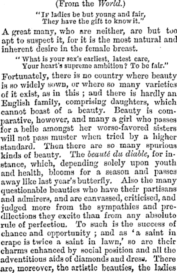 (From the World.) “IP ladies be but young and fair. They have the gift to know it. A great many, who are neither, are but too apt to suspect it, for it is the most natural and inherent desire in the female breast. “ What is your sex’s earliest, latest care. Your heart’s supremo ambition ? To bo fair.” Fortunately, there is no country where beauty is so widely sown, or where so many varieties of it exist, as in this ; and there is hardly an English family, comprising daughters, which cannot boast of a beauty. Beauty is comparative, however, and many a girl who passes for a belle amongst her worse-favored sisters will not pass muster when tried by a higher standard. Then there are so many spurious kinds of beauty. The heauti du diahle, for instance, which, depending solely upon youth and health, blooms for a season and passes away like last year’s butterfly. Also the many questionable beauties who have their partisans and admirers, and are canvassed, criticised, and judged more from the sympathies and predilections they excite than from any absolute rule of perfection. To such is the success of chance and opportunity ; and as ‘ a saint in crape is twice a saint in lawn,' so are their charms enhanced by social position and all the adventitious aids of diamonds and dress. There are, moreover, the artistic beauties, the ladies