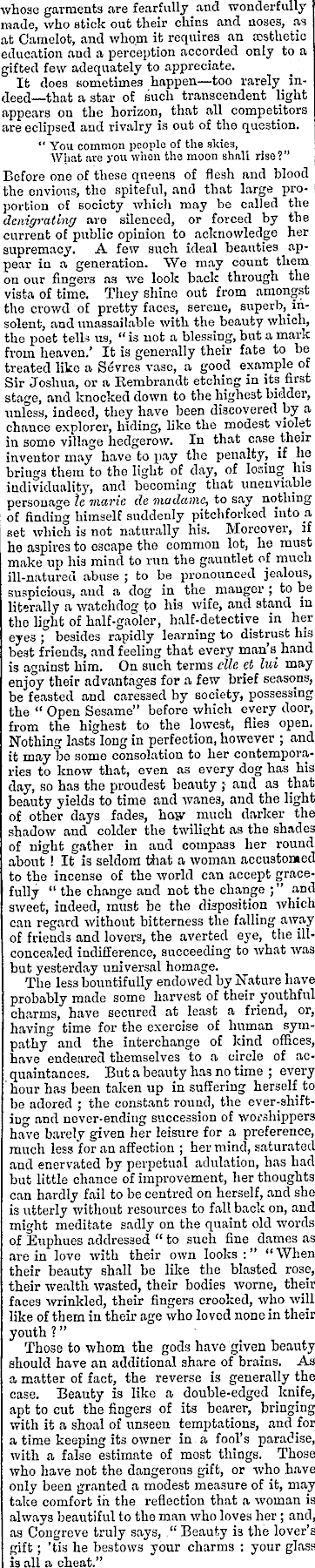 whose garments are fearfully and wonderfully made, who stick out their chins and noses, as at Oamelot, and who.m it requires an aesthetic education and a perception accorded only to a gifted few adequately to appreciate. It does sometimes happen—too rarely indeed—that a star of such transcendent light appears on the horizon, that all competitors are eclipsed and rivalry is out of the question. “ You common people of the skies, What are you when the moon shall rise?” Before one of these queens of flesh and blood the envious, the spiteful, and that large proportion of society which may be called the denigrating are silenced, or forced by the current of public opinion to acknowledge her supremacy. A few such ideal beauties appear in a generation. We may count them on our fingers as we look back through the vista of time. They shine out from amongst the crowd of pretty faces, serene, superb, insolent, and unassailable with the beauty which, the poet tells us, “is not a blessing, but a mark from heaven.’ It is generally their fate to be treated like a Sdvres vase, a good example of Sir Joshua, or a Kembrandt etching in its first stage, and knocked down to the highest bidder, unless, indeed, they have been discovered by a chance explorer, hiding, like the modest violet in some village hedgerow. In that case their inventor may have to pay the penalty, if he brings them to the light of day, of losing his individuality, and becoming that unenviable personage Xe marie de madame , to say nothing of finding himself suddenly pitchforked into a set which is not naturally his. Moreover, if he aspires to escape the common lot, he must make up his mind to run the gauntlet of much ill-natured abuse ; to be pronounced jealous, suspicious, and a dog in the manger to be literally a watchdog to his wife, and stand in the light of half-gaoler, halt-detective in her eyes ; besides rapidly learning to distrust his best friends, and feeling that every hand is against him. On such terms die et lui may enjoy their advantages for a few brief seasons, be feasted and caressed by society, possessing the “ Open Sesame” before which every door, from the highest to the lowest, flies open. Nothing lasts long in perfection, however ; and it may be some consolation to her contemporaries to know that, even as every dog has his day, so has the proudest beauty ; and as that beauty yields to time and wanes, and the light of other days fades, haw much darker the shadow and colder the twilight as the shades of night gather in and compass her round about! It is seldom that a woman accustomed to the incense of the world can accept gracefully “ the change and not the change ; ” and sweet, indeed, must be the disposition which can regard without bitterness the falling away of friends and lovers, the averted eye, the illconcealed indifference, succeeding to what was but yesterday universal homage. The less bountifully endowed by Nature have probably made some harvest of their youthful charms, have secured at least a friend, or, having time for the exercise of human sympathy and the interchange of kind offices, have endeared themselves to a circle of acquaintances. But a beauty has no time ; every hour has been taken up in suffering herself to be adored ; the constant round, the ever-shift-ing and never-ending succession of worshippers have barely given her leisure for a preference, much less for an affection ; her mind, saturated and enervated by perpetual adulation, has had but little chance of improvement, her thoughts can hardly fail to be centred on herself, and she is utterly without resources to fall back on, and might meditate sadly on the quaint old words of Euphues addressed “to such fine dames as are in love with their own looks : ” “ When their beauty shall be like the blasted rose, their wealth wasted, their bodies wome, their faces wrinkled, their fingers crooked, who will like of them in their age who loved none in their youth ?” Those to whom the gods have given beauty should have an additional share of brains. As a matter of fact, the reverse is generally the case. Beauty is like a double-edged knife, apt to cut the fingers of its bearer, bringing with it a shoal of unseen temptations, and for a time keeping its owner in a fool’s paradise, with a false estimate of most things. Those who have not the dangerous gift, or who have only been granted a modest measure of it, may take comfort in the reflection that a woman is always beautiful to the man who loves her; and, as Congreve truly says, Beauty is the lover’s gift; ’tis he bestows your charms ; your glass is all a cheat.”