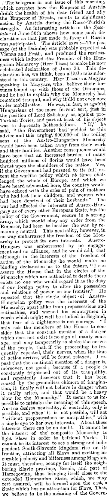 'The'telegram in our issue of this morning, which narrates how the Emperor of Austria drank the health of his dear friend and ally the Emperor of Russia, points to significant action by Austria during the Russo-Tnrkish struggle. An interesting article in the Spec-, tator of June 30th shows how : some such declaration as that just made ,iu favor of Russia was .anticipated. The article, says : —The passage (of the Danube) was probably expected at Vienna and Pesth, and produced the restlessness which induced the Premier of the Hungarian Monarchy (Herr Tisza) to make Ids now celebrated declaration of June 26. I his declaration has, we think, been a little misunderstood in this country. Herr Tisza is a Magyar speaking to Magyars. who believe their fortunes bound up with, of the Ottomans, and he had to explain why the Monarchy had remained tranquil, and why it did not evfen now order mobilisation. He was, in fact, as against Hungarians of the more fervent sort, just in the position of Lord Salisbury as..against proTurkish Tories, and part at least of his object was to deprecate hotlieadedness, “If,” he said, “ the Government had yielded to this advice and this urging, 600,000 of the toiling sons of the Austro-Hungarian Monarchy would have been taken away from their work and their families. Another consequence would have been that an increased burden of many hundred millions of florins would have been thrust upon the shoulders of the nation. Yes, if the Government had pursued to its full extent the warlike policy which at times challenged the whole of Europe, and which we have heard advocated here, the country would have echoed with the cries of pain of mothers who had lost their children, and women who had been deprived of their husbands.” The war had affected the interests of Austro-Hun-gary as of every other European State, but the policy of the Government, secure in a strong army, which would obey any order from the Emperor, had been to localise the war by remaining neutral. This neutrality, however, in no way embarrassed the freedom of the Monarchy to protect its own interests. AustroHungary was embarrassed by no engagement and no alliance, and he would add, that although in the interests of the freedom of action of the Monarchy he would make no binding declaration as to the future, “ I can assure the House that in the circles of the Monarchy which are authorised to decide there exists no one who would regard it as the duty of our foreign policy to alter the possession and relations of power on our frontier.” He repeated that the single object • of AustroHungarian policy was the interests of the Monarchy, apart alike from prepossessions and antipathies, and warned his countrymen in words which might well be studied in England, that fear of a nightmare is not courage. “ X only ask the members of the House to consider that the constant mention of a danger which does not exist is no sign of manly courafe, and may temporarily so shake the nerves of the people, that, if the proceeding be frequently repeated, their nerves, when the time of action arrives, will be found relaxed. I repeat that the continual mention of a danger is, moreover, not good ; because if a people is constantly frightened out of its tranquility, and repeatedly discovers that it has been roused by the groundless chimera of imagination, it finally will not believe in danger when it really arises, and that would be a heavy blow for the Monarchy.” It seems to us impossible to mistake the meaning of this speech. Austria desires neutrality, if neutrality only is possible, and when it is not possible, will act “ without prepossessions or antipathies,” with a single eye to her own interests. About those interests there can be no doubt. It cannot be the interest of the' composite Monarchy to fight Slavs in order to befriend Turks. It cannot be its interest to see a strong and independent South-Slavonic Kingdom rise on its frontier, attracting all Slava and exciting incurable jealousy and bitterness among Magyars. It must, therefore, occupy tor itself the neighboring Slavic province, Bosnia, and part of Herzegovina, thus bringing itself close to the extended Roumanian State, which, we may rest assured, will bo formed upon the east, a State which has no attraction for Slavs. That, wo believe to bo the meaning of the Govern-