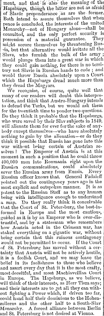 ment, and that' is -also ■ the meaning of the ' Hapshurgs, though the latter, are not as afraid of Slavic preponderance ,'as are the former. Both intend to assure themselves that when peace is concluded, the interests of the united Monarchy—not of Hungary alone —shall he consulted, and the only perfect security is possession of a material guarantee. They might secure themselves by threatening Russia, but that alternative would irritate all the Slavs, who furnish the bulk of the army ; would plunge them into a great war in which they could gain nothing, for there is no territory not Slavic in Russian hands to cede ; and would throw Russia absolutely upon a Court which the Hapshurgs dread much more than they dread the Magyars. We recognise, of course, quite well that many of our readers will doubt this interpretation, and think that Austro-Hungary intends to defend the Turks, but we would ask them for the twentieth time to ponder two questions. Do they think it probable that the Hapshurgs, who were saved by their Slav subjects in 1849, will alienate them for ever for the sake of anybody except themselves—who have absolutely nothing to gain by the alienation—or do they think it possible that Russia has gone into tills war without being certain of Austrian resolves ? The Emperor of Austria is at this moment in such a position that he could throw 400,000 men into Roumania right upon the Russian communications, could absolutely sever the Russian army from Russia. Every Russian officer knows that. General Eadaieff pointed out the contingency years ago in the most explicit and outspoken manner. It is as patent to the Russian Staff as to any human being with intelligence enough to understand a map. Do they really think it conceivable that the Court of St. Petersburg, the best-in-formed in Europe and the most cautious, guided as it is by an Emperor who is over-dis-trustful, and by a statesman who remembers how Austria acted in tho Crimean war, has staked everything on a gigantic war, without being certain that this ruinous contingency would not be permitted to occur. If the Court of St. Petersburg has moved without a certainty that Austria will not be actively hostile, it is a foolish Court, and we may leave the belief in its foolishness to those who believe and assert every clay that it is the most crafty, most deceitful, and most Machiavellian Court in Europe. The Hapshurgs, as we believe, will think of their interests, as Herr Tisza says; and their interests are to get all they can without fighting a Power which, if driven too far, could hand half their dominions to the Hohenzoilerns and the other half to a South-Slav Monarchy. A forced alliance between Berlin and St. Petersburg is not desired at Vienna.