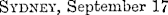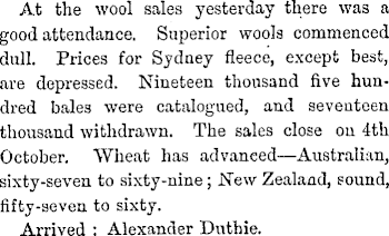 At the wool sales yesterday there was a good attendance. Superior wools commenced dull. Prices for Sydney fleece, except best, are depressed. Nineteen thousand five hundred bales were catalogued, and seventeen thousand withdrawn. The sales close on 4th October. Wheat has advanced—Australian, sixty-seven to sixty-nine; New Zealand, sound, fifty-seven to sixty. Arrived : Alexander Dntbie.