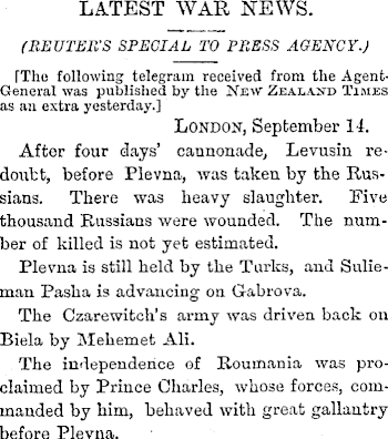 LATEST WAR NEWS. (REUTER'S SPECIAL TO PRESS AGENCY.) IThc following telegram received from the AgentGeneral was published by the New Zealand Times as an extra yesterday.} London, September 14. After four days’ cannonade, Levusin redoubt, before Plevna, was taken by the Russians. There was heavy slaughter. Five thousand Russians were wounded. The number of killed is not yet estimated. Plevna is still held by the Turks, and Sulieman Pasha is advancing on Gabrova. The Czarewitoh's army was driven back on Biela by Mehemet AH. The independence of Roumania was proclaimed by Prince Charles, whose forces, commanded by him, behaved with great gallantry before Plevna.