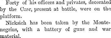 Forty of Ilia officers and privates, decorated by the Czar, present at battle, were on the platform. Nicksich has been taken by the Montenegrins, with a battery of gnus and war material.