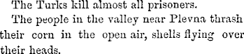 The Turks kill almost all prisoners. The people in the valley near Plevna thrash their corn in the open air, shells flying over their heads.