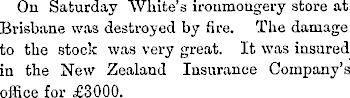 On Saturday White’s ironmongery store at Brisbane was destroyed by fire. The damage to the stock was very great. It was insured in the New Zealand Insurance Company’s office for £3OOO.