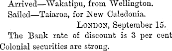 Arrived—Wakatipu, from Wellington. Sailed—Taiaroa, for New Caledonia. London, September 15. The Bank rate of discount is 3 per cent. Colonial securities are strong.