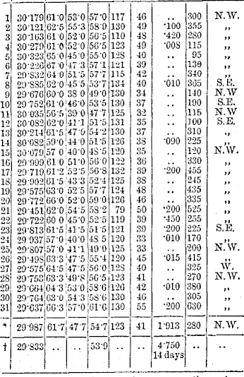 1 SO'179 01-0 53-0 57-0 117 40 300 N.W. 2 30121 62*5 55*3 589 130 49 *100 355 „ 3 30103 61 0 52*0 5G*5 no 48 *420 280 „ 4 30-279 61 0 52-0 56-5 123 49 •008 115 „ 5 30‘323 65-0 45'0 55*0 X2S 40 95 „ 6 80-2*20 67*0 47 3 571 121 39 139 ,, 7 2D‘S32 04 0 51*5 577 115 42 340 8 29-885 02-0 45 5 53*7 134 40 •oio 365 S.E. 9 29-676 60-0 38 0 49*0 130 34 140 N.W 10 29752 ero^e-o 53-6 130 37 190 S.E. 11 80035 50*51399 477 125 32 115 N.W 12 SO-OS-2 62*0 41*1 51*5 131 35 JOO S.E. 13 30*214 61*5 47*0 54*2 130 37 310 ,, 14 80*082 59'0!440 51*5 126 38 •090 225 ,, 15 30-079 57 0 40*0 4S-5 120 85 1-20 N.W. 1C 29 999 61-0-51-0 560 122 36 330 „ 17 29719 61*2 !S2*5 56*8 132 39 *200 455 18 29:902 01*5 ! 43’3 521 125 38 245 „ 19 29*575 63*0 52 5 57'7 124 48 435 „ 20 29 772 660'520 590 126 46 335 „ 21 29-451 G2’0 54-5 58’2 79 60 •200 525 .. 29 29-722 60 0*45*0 52'5 110 39 *450 255 ,, 23 20*813 61*o 41 *5 51 "5 121 39 *200 225 S.E. 24 29 937 57*0 ;40*0 48 5 120 33 *010 170 ,, 25 29-807 57 0 41-1 400 125 33 200 N.W. 26 29*498 03-3'47-5 55*4 120 45 ■015 415 ,, 27 29-575 G4*5:47‘5 50*0 12S 40 325 w. 28 29-753 C3’3 1 49*8 50*5 123 41 270 N.W. 29 29'CfM 643 '03-0 53 "6 126 42 ■oio 380 ,, 30 29-7G4 03-0,54 3 58-6 130 46 305 ,, 31 29-637 CO-3 57*0 61‘C 130 65 •200 630 ” * 29-987 6171477 547 123 41 1-013 280 N.W. t 20-S33 53-9 4-750 14 days