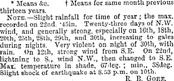 * Means &c. t Means for same month previous thirteen years. Note. —Slight rainfall for time of year ; the max. recorded on 22nd. *4sin. Twenty-three days of N.W. wind, and generally strong, especially on 10th, 18th, 20th, 25th, 28th, 29th, and 30th, increasing to gales during nights. Very violent on night of 30th, with rain. On 12th, strong wind from S.E. On 22nd, lightning to S., wind N.AV., then changed to S.E. Maxi temperature in shade. C7deg. ; min., 38deg. Slight shock of earthquake at 8.53 p.m. on 10th. R. B. Gore.