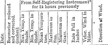 -g From Self-Kegistering Instrument 8 tor 24 hours previously | Date. Barometer rcdu and corrected, (inches). a 3 c3 3 S55 Min. Temp, in | Shade. | Mean Tempera- | ture. 1 a S 1. 5 s See Minimum on { Grass. Bain Fall in Inches Veloc. "Wind in 1 Miles. * a & Pi