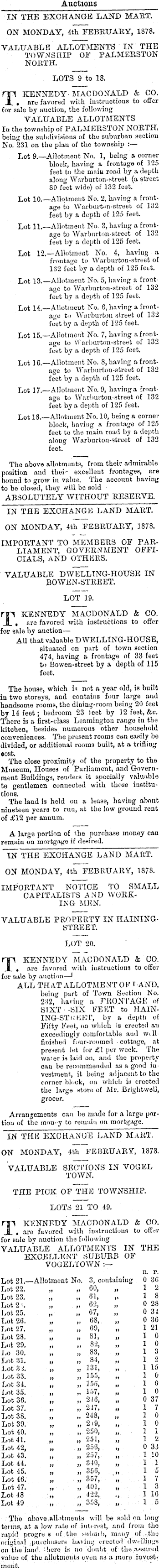 Auctions IN THE EXCHANGE LAND MART. ON MONDAY, 4th FEBRUARY, 1878. VALUABLE ALLOTMENTS IN THE TOWNSHIP OF PALMERSTON NORTH. LOTS 9 to 18. T KENNEDY - MACDONALD & CO. • are favored with instructions to offer for sale by auction, the following VALUABLE ALLOTMENTS In the township of PALMERSTON NORTH, being the subdivisions of the suburban section No. 231 on the plan of the township : Lot 9.—Allotment No. 1, being a corner block, having a frontage of 125 feet to the main road by a depth 1 along Warburton-street (a street 80 feet wide) of 132 feet. Lot 10. —Allotment No. 2, having a frontage to Warburton-street of 132 feet by a depth of 125 feet. Lot 11.—Allotment No. 3, having a frontage to Warburton-street of 132 feet by a depth of 125 feet. Lot 12.— Allotment No. 4, having a frontage to Warburton-street of 132 feet by a depth of 125 feet. . Lot 13.—Allotment No. 5, having a frontage to Warburton-street of 132 feet by a depth of 125 feet. Lot 14.—Allotment No. 6, having a frontage to Warburton street of 132 feet by a depth of 125 feet. Lot 15.— Allotment No. 7, having a frontage to Warburton-street of 132 feet by a depth of 125 feet. Lot 16. —Allotment No. 8, having a frontage to Warburton-street of 132 feet by a depth of 125 feet. Lot 17.—Allotment No. 9, havinga frontage to Warburton-street of 132 feet by a depth of 125 feet. Lot IS. —Allotment No. 10, being a corner block, having a frontage of 125 feet to the main road by a depth along Warburton-street of 132 feet. The above allotments, from their admirable position and thei- excellent frontages, are bound to grow in value. The account having to be closed, they will be sold ABSOLUTELY WITHOUT RESERVE. IN THE EXCHANGE LAND MART.' ON MONDAY, 4th FEBRUARY, 1878. IMPORTANT TO MEMBERS OF PARLIAMENT, GOVERNMENT OFFICIALS, AND OTHERS. VALUABLE DWELLING-HOUSE IN BOWEN-STREET. LOT 19. T KENNEDY MACDONALD & CO. , are favored with instructions to offer for sale by auction— All that valuable DWELLING-HOUSE, situated on part of town section 474, having a frontage of 33 feet to Bowen-street by a depth of 115 feet. The house, which is not a year old, is built in two storeys, and contains four large and handsome rooms, the dining-room being 20 feet by 14 feet; bedroom 23 leet by 12 feet, &c. There is a first-class Leamington range in the kitchen, besides numerous other household conveniences. The present rooms can easily be divided, or additional rooms built, at a trifling •ost. The close proximity of the property to the Museum, Houses of Parliament, and Government Buildings, renders it specially valuable te gentlemen connected with those institutions. The land is held on a lease, having about nineteen years to run, at the low ground rent of £l2 per annum. A large portion of the purchase money can remain on mortgage if desired. IN THE EXCHANGE LAND MART. ON MONDAY, 4th FEBRUARY, 1878. IMPORTANT NOTICE TO SMALL CAPITALISTS AND WORKING MEN. VALUABLE PROPERTY IN HAININGSTREET. LOT 20. T KENNEDY MACDONALD & CO. , are favored with instructions to offer for sale by auction—l ALL THAT ALLOTMENT OF J AND, being part of Town Section No. 232, having a FRONTAGE of SIXT -SIX FEET to HAIN-ING-STiiEET, by a deptli of Fifty Feet, on which is erected an exceedingly comfortable and willfinished four-roomed - cottage, at present let for £1 per week. The. warer is laid on, and the property can be recommended as a good investment, it being adjacent to the corner block, on which is erected the large store of Mr. Brightwell, grocer. Arrangements can be made for a large portion of the money to remain on mortgage. IN THE EXCHANGE LAND MaRT. ON MONDAY, 4th FEBRUARY, 1878. VALUABLE SECTIONS' IN VOGEL TOWN. THE PICK OF THE TOWNSHIP. LOTS 21 TO 49. T KENNEDY MACDONALD & CO. « are favored with instructions to offer for sale by auction the following VALUABLE ALLOTMENTS IN THE EXCELLENT SUBURB OF VOGELTOWN it. r. The above.allotments will be sold on long terms, at a low rate of interest, and from the rapid progre s of .the sidmib, many of the, original purchasers having erected dwellings on theland, -'hero is no doubt of the assured value of the allotments oven as a mere .invest' incut.