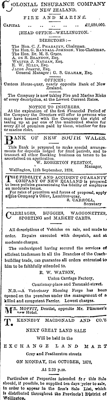 C' colonial Insurance company U Oi’ NEW ZEALAND. XflBE AND MARINE. Capital £2,000,000. IHEAD OFFICE—WELLINGTON. ' DIRECTORS The Hon. C. J. Pharazyn, Chairman. The Hon. G. Randall Jounsow, Vice-Chairman, The Hon. Dr. M. S. Grace. A. dk B. Brandon, Esq. Walter J. Nathan, Esq. E. W. .Mills, Esq. Jacoc Joseph, Esq. General Manager: G. 5. Graham, Esq. OFFICES: Custom House-quay, nearly opposite Bank of New Zealand. The Company Is now* taking Fire and Marine Risks of every description, at the Lowest Current Rates, NOTICE TO INSURERS. At tlio expiration of the first Financial Period of the Company the Directors wilt offer to persons who may have insured with the Company the right of taking up at par one of the unallotted shares for every £1 of premium paid by them, whether for fire or marine risks. jgANK OF JNKW SOUTH WALKS. This Bank is prepared to make special arrangemeats for deposits lodged for fixed periods, and to transact all other Banking business on terms to be ascertained on application. W. ROBERTON PERSTON, 1 Manager. Wellington, 11th September, 1878. fTIHE FIDELITY AND ACCIDENT GUARANTY JL COMPANY OtT NEW ZEALAND is prepared to issue policies guaranteeing the fidelity of employes on moderate terms. For rates of premium and forms of proposal, apply* at|the Company's Ollice, Lambton-quay. 8, CARROLL, Secretary CARRIAGES, BUGGIES, WAGGONETTES, SPORTING and MARKET CARTS. All descriptions of Vehicles on sale, and made to order. Repairs executed with despatch, and at moderate charges. The undersigned having secured the services of efficient tradesmen In all the Branches of the Coachbuilding trade, can guarantee all orders entrusted to him to bo faithfully attended to. E, W. WATSON, Union Carriage Factory. Courtonay-placo and Taranaki-streetv N.B.—A Veterinary Shooing Forgo has been opened on the premises under the management of a killed and competent Farrier, Lowest charges. MR. MOFFIT, Dentist, opposite Mr, Plimmcr’s tw-w Hotel, fjl KENNEDY MACDONALD AND CO.’S NEXT GREAT LAND SALE Will be held In the EXCHANGE LAND U ART Grey and Featherston streets ON MONDAY, 21st OCTOBER, 1878, j At 2.20 p.m. Particulars of Properties intended fo r this Sale I should, if possible, be supplied ten days sprier to sale, ! In order to appear In the firm’s Salo List, which is distributed throughout the Provincial District of Wellington,