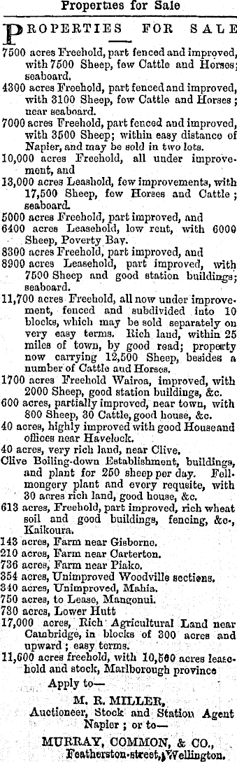 Properties for Sale PROPERTIES FOR SALE JL 7500 acres Freehold, part fenced and improved, with 7500 Sheep, few Cattle and Horses; seaboard, 4300 acres Freehold, part fenced and improved, with 3100 Sheep, few Cattle and Horses ; near seaboard. 7000 acres Freehold, part fenced and improved, with 3500 Sheep; within easy distance of Napier, and may be sold in two lots. 10,000 acres Freehold, all under improvement, and 13,000 acres Leashold, few improvements, with 17,500 Sheep, few Horses and Cattle ; seaboard. 5000 acres Freehold, part improved, and 6400 acres Leasehold, low rent, with 6000 Sheep, Poverty Bay. 8300 acres Freehold, part improved, and 8900 acres Leasehold, part improved, with 7500 Sheep and good station buildings; seaboard. 11,700 acres Freehold, all now under improvement, fenced and subdivided into 10 blocks, which may be sold separately on very easy terms. Rich land, within 25 miles of town, by good read; property now carrying 12,500 Sheep, besides a number of Cattle aud Horses, 1700 acres Freehold Wairoa, improved, with 2000 Sheep, good station buildings, &c. 600 acres, partially improved, near town, with 800 Sheep, 30 Cattle, good house, &e. 40 acres, highly improved with good Houseand offices near Haveloclc 40 acres, very rich land, near Clive. and plant for 250 sheep per day. Fellmongery plant and evory requeite, with '3O acres rich land, good house, &c. 613 acres, Freehold, part improved, rich wheat soil and good buildings, fenoing, &o-, Kaikoura. 143 acreß, Farm near Giaborno. 210 acres, Farm near Carterton. 736 acres, Farm near Piako. 354 acres, Unimproved Woodville sections, 840 acres, Unimproved, Mahia. 750 acreß, to Lease, Mangonui. 780 acres, Lower Hutt 17,000 acres,; Rich' Agricultural Land near Cambridge, in blocks of 300 aores and upward; easy terms. 11,600 acres freehold, with 10,590'.notes leasehold and stock, Marlborough pro vines . : ,. .;.■ Apply to-- ■.',:':';'"; .- : t : .- M. R. MILLER.V Auctioneer, Stock 1 and; Station Agent Napier; or to— MURRAY, COMMON, & CO., ■'■ . ; Featherßton-Btteet.jWeUington.