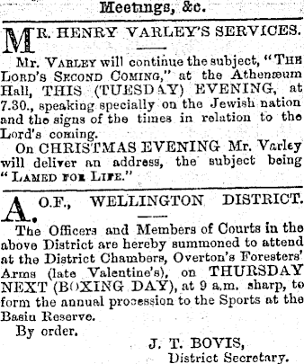 - Meetings, «e. Lfl-R. HENRY yARLEY'S SERVICES. Mr. Vabley will continue the subject, " Thh Eobd's Skcond Comiko," at the Athenraum Hall, THIS (TUESDAY) EVENING, at 7.30., speaking specially on the Jewish nation and the signs of the times in relation to the Lord's coming. On CHRISTMAS EVENING Mr. Varlty will deliver an address, the" Bubject being " Lambd vox Liie." 0.F., WELLINGTON DISTRICT. The Officers and Members of Courts in the above District are hereby summoned to attend at the District Chambers, Overton's Foresters' Arms (late Valentine's), on THURSDAY NEXT (BOXING DAY), at 9 a.m. sharp, to form the annual prooession to the Sports at the Basin Reserve. Br order. ,■ J. T. BO VIS, District Secretary.