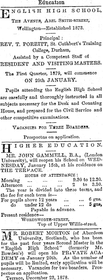 Education ■ENGLISH HIGH SCHOOL, The Avenue, Abel Smith-stbebt, Wellington—Established 1873. Principal : REV. T. PORRITT, St. Cuthbert's Training College, Durham, Assisted by a Competent Staff of RESIDENT AND VISITING MASTERS. Tie First Quarter, 1879, will cc " ON 20th JANUARY. Pupils attending the English High School are oarefully and thoroughly instructed in all subjects necessary for the Desk and Counting House, and prepared for the Civil Service and other competitive examinations. Vacancies foe Three Boabdbrs. Prospectus on application. "IGHER EDUCATION. ~~MFv. JOHN GAMMELL, 8.A., (London University), will reopen his School on WEDNESDAY, January 15th, at his residence on THE TERKAOE. • HODBS 01? ATTENDANCE : Morning ... 9.30 to 12.30. Afternoon 2 to 3.30. The year is divided into thrae term?, and the fee for each term is— For pupils above 12 years ... ... 6 gns. do under 12 do ... ... 5g Payable in advanos. Present residence— WOEDS WORTH-STBEET, Top of Upper Willis-Btreet. V /jTR. ROBERT MORTON (of Aberdeen _VjL University, Scotland), who has been for the past four years Second Master in the "English High School" (formerly Mr. Bowden'a) will open his PRiVATE ACADEMY on January 20th. As the number of pupils will be limited, early application will be necessary. Vacancies for two boarders. Prospectus on application. Terrace. December 23, 1878.