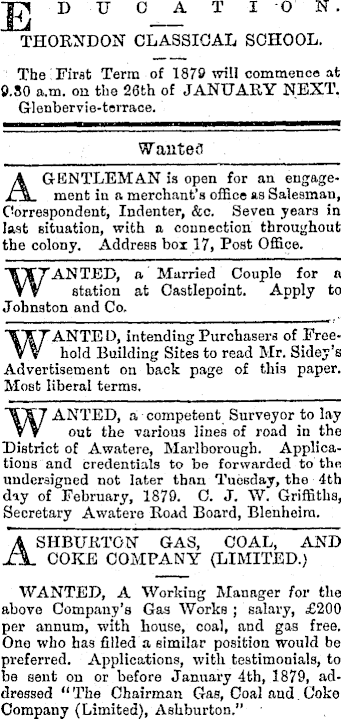 1 D U 0 A T lON. -»_J - THORNDON CLASSICAL SCHOOL. The First Term of 1879 will commence at 9.80 a.m. on the 26th of JANUARY NEXT. Glenbervie-terrace. A GENTLEMAN is open for an enj ment in a merchant's office as Sales Correspondent, Indenter, &c. Seven years in last situation, with a connection throughout the colony. Addresß box 17, Post Office. ANTED, a Married Couple for a i v station at Castlepoint. Apply to Johnston and Co. D, intending Purchasers of Freeuoia jiuilding Sites to read Mr. Sidey's isement on back page of this paper. Most liberal terms. T|7 ANTED, a competent Surveyor to lay i V rmt the various lines of road in the atere, Marlborough. Applicamuuo nuu uieuentials to be forwarded to the undersigned not later than Tuesday, the 4th day of February, 1879. C. J. W. Griffiths, Secretary Awatere Road Board, Blenheim. . SHBUKTON GAS, COAL, AND I. COKE COMPANY (LIMITED.) WANTED, A Working Manager for the above Company's Gas Works ; salary, £2OO per annum, with house, coal, and gas free. One who has filled a similar position would be preferred. Applications, with testimonials, to be sent on or before January 4th, 1879, addressed " The Chairman Gas, Coal and. Coke Company (Limited), Ashburton."