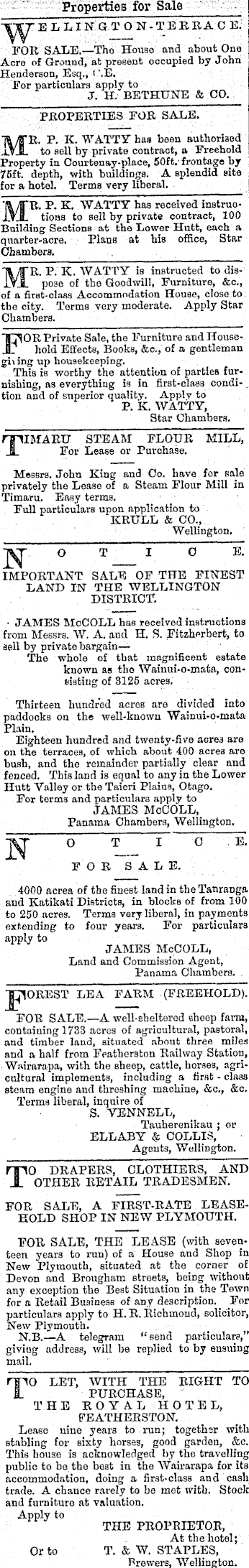 Properties for Sale ElillN.Ql'ON-TEEKACE. FOR SALE.—The House and about One 'ore of Ground, at present occupied by John Anderson, Esq., < \E. For particulars apply to J. H. BETHUNE & CO. PROPERTIES FOR SALE. "R. P. K. WATTY has been authorised to sell by private contract, a Freehold ty in Oourtenay-place, 50ft.-frontage by 7611. depth, with buildings. A splendid Bite for a hotel. Terms very liberal. "R. P. K. WATTY has received instructions to sell by private contract, 100 ing Sections at the Lower Hutt, each a qumter-acre. Plans at his office, Star Chambers. "R. P. K. WATTY is instructed to dispose of the Goodwill, Furniture, &c, rat-class Accommodation House, close to; tue city. Terms very moderate. Apply Star Chambers. 10E Private Sale, the Furniture and Household Effects, Books, See., of a gentleman i ing up housekeeping. This is worthy the attention o£ parties furnishing, as everything is iu first-class condi-, tion and of superior quality. Apply to P. K. WATTY, Star Chambers. TIMARU STEAM FLOUR MILL, For Lease or Purchase. Messrs. John King and Co. have for sale privately the Lease of a Steam Flour Mill in Timaru. Easy terms. Full particulars upon application to KRULL & CO., Wellington. IMPORTANT SALE OF THE FINEST LAND IN THE WELLINGTON DISTRICT. • JAMES MoCOLL has received instructions from Messrs. W. A. and H. S. Fitzherbert, to sell by private bargain— The whole of that magnificent estate known as the Wainui-o-matfl, consisting of 3125 acres. Thirteen hundred acres are divided into paddocks on the well-known Wainui-o-mata Plain. Eighteen hundred and twenty-five aore3 are on the terraces, of which about 400 acrea are bush, and the remainder partially clear and fenced. This land is equal to any in the Lower Hutt Valley or the Taieri Plains, Otago. For terms and particulars apply to JAMES McCOLL, Panama Chambers, Wellington. FOR SALE. 4000 acrea of the finest land in the Tanranga iti Districts, in blocks of froi js. Terms very liberal, in pay extending to four years. For particulars apply to JAMES McCOLL, Land and Commission Agent, Panama Chambers. . 10REST LEA FARM (FREEHOLD). FOR SALE.—A well-sheltered sheep farm, containing 1733 acres of agricultural, pastoral, and timber land, situated about three miles and a half from Featherston Railway Station, Wairarapa, with the sheep, cattle, horses, agricultural implements, including a first - class steam engine and threshing machine, &c, &c. Terms liberal, inquire of S. YENNELL, Tauherenikau ; or ELLABY & COLLIS, Agents, Wellington. TO DRAPERS, CLOTHIERS, AND OTHER RETAIL TRADESMEN. FOR SALE, A FIRST-RATE LEASEHOLD SHOP IN NEW PLYMOUTH. FOR SALE, THE LEASE (with seventeen years to run) of a House and Shop in New Plymouth, situated at the corner of Devon and Brougham streets, being without any exception the Best Situation in the Town for a Retail Business of any description. For particulars apply to H. R. Richmond, solicitor, New Plymouth. N.B.—A telegram "send particulars," giving address, will be replied to by ensuing mail. HO LET, WITH THE RIGHT TO I. PURCHASE, THE ROYAL HOTEL, FEATHERSTON. Lease nine years to run; together with stabling for Bixty horses, good garden, &c. This house is acknowledged by the travelling public to be the best in the Wairarapa for its accommodation, doing a first-class and cash trade. A chance rarely to be met with. Stock and furniture at valuation. Apply to THE PROPRIETOR, Atthehotel; Or to T. & W. STAPLES, Brewers, Wellington.