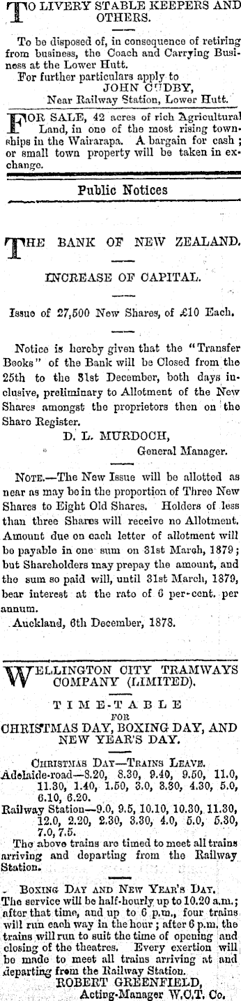 TO LIVERY STABLE KEEPERS AND OTHERS. To be disposed of, in consequence of retiring from business, the Coach and Carrying Business at the Lower Hutfc. For further particulars apply to JOHN CHDBY, Near Railway Station, Lower Hutt. es of rich Agricultural B ' Land, in one of the most rising townships in the Wairarapa. A bargain for cash ; or small town property will be taken in exchange. PuMic Notices IHE BANK OF NEW ZEALAND, INCREASE OP CAPITAL. Issue of 27,500 New Shares, of £lO Each. Notice is hereby given that the " Transfer Books" of the Bank will be Closed from the 25th to the 31st December, both days inclusive, preliminary to Allotment of the New Shares amongst the proprietors then on the Sharo Register. D. L. MURDOCH, • General Manager. Note.—The New Issue will be allotted as near as may be in the proportion of Three New Shares to Eight Old Shares. Holders of less than three Shares will receive no Allotment. Amount due on oaoh letter of allotment will be payable in one sum on 31st Maroh, 1879; but Shareholders may prepay the amount, and the sum so paid will, until 31st March, 1879, bear interest at the rato of 6 per-cent. per annum. Auckland, Bth December, 1878. ELLINGTON CITY TRAMWAYS COMPANY (LIMITED). TIM E-T ABLE FOB CHRISTMAS DAY, BOXING DAY, AND NEW YEAR'S DAY. Ohristsias Dat—Trains Leave. Adelaide-road—B.2o, 8.30, 9.40, 9.50, 11.0, 11.30, 1.40, 1.50, 3.0, 3.30, 4.30, 5.0, 6.10, 6.20. Railway Station—9.o, 9.5, 10.10,10.30,. 11.30, 12.0, 2.20, 2,30, 3.30, 4.0, 5.0, 5.30, 7.0,7.5. Tho above trains are timed to meet all trains arriving and departing from the Railway Station. ..;, , . ,-'■ ;;,:,;; . BOXINS DAT AND NEW YEAR'S DAT.; The service will bo half-hourly, up to 10.20 am.; after that time, and up to 6 p.m., four trains will run eaoh way in the hour; after 6 p.mi the trains will run to suit the time of opening [and closing of the theatres. Every exertion will, be made to meet all trains arriving at and departing fr«m the Railway Station. ; ROBERT GREENFIELD, j :■■■■.■;) ,';:,;■: ; ;, Acting-Manager W.OJ 1 , Qp.y ,