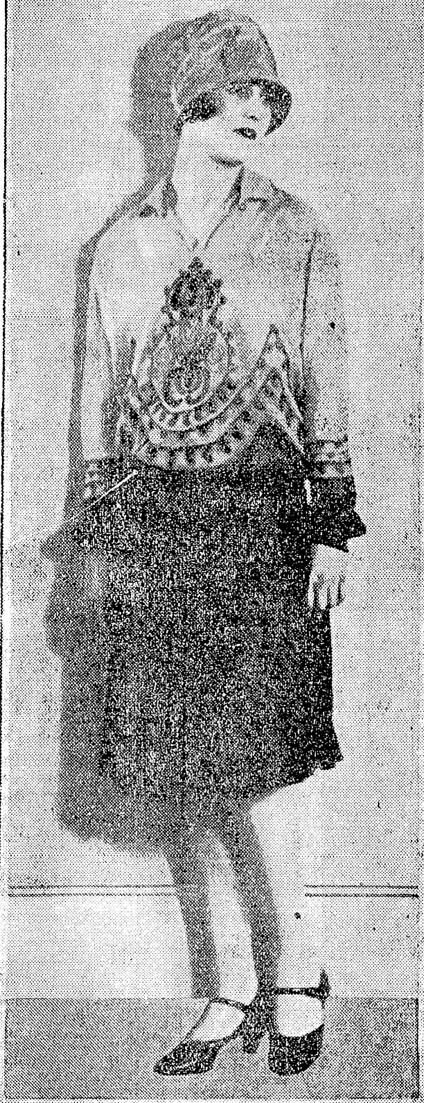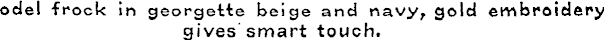 12odel frock in georgette beige and navy, gold embroidery gives smart touch. NZ Truth, Issue 1152, 29 December 1927, Page 3