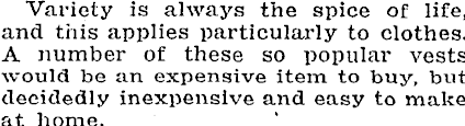 Variety is always the spice of life, and this applies particularly to clothes. A number of these so popular vests would be an expensive item to buy, but decidedly inexpensive and easy to make at home.