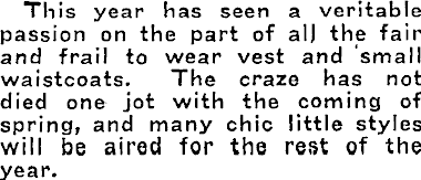 This year has seen a veritable passion on the part of al] the fair and frail to wear vest and small waistcoats. The craze has not died one jot with the coming of spring, and many chic little styles will be aired for the rest of the year.