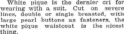 White pique is the dernier cri for Avearing with a suit. Cut on severe lines, double or single breasted, with large pearl buttons as fasteners, the white pique waistcoat is the nicest thing.