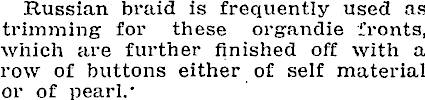 Russian braid is frequently used as trimming for these organdie i'ronts, which are further finished off with a row of buttons either of self material or of pearl.'