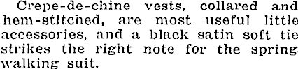 Crepe-de-chine vests, collared and hem-stitched, are most useful little accessories, and a black satin soft tie strikes the right note for the spring walking suit.