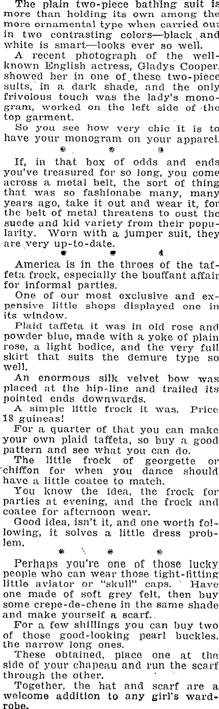 The plain two-piece bathing suit is more than holding- its own among the more ornamental type -when cai-ried blu in two contrasting- colors — black . and white is smart — looks ever so well. A recent photograph of the wellknown English actress, Gladys Cooper, showed her in one of, these two-piece suits, in a dark shade, and the onlyfrivolous touch was the lady's monogram, worked on the left side of the top garment. So you see how very chic it is to have your monogram on your apparel. # . « =» If, in that box of odds and ends you've treasured for so long, you come across a metal belt, the sort of thing that was so fashionabe many, many years ago, take it out and wear it, for the belt of metal threatens to oust the sued© and kid variety from their popularity. "Worn with a jumper suit, they are very up-to-date. # m * America is in the throes of the taffeta frock, especially the bouffant affair for informal parties. One of our most exclusive and exp.ensive little shops displayed one in its window. Plaid taffeta it was in old rose and powder blue, made with a yoke of plain rose, a light bodice, and the very full skirt that suits the demure type so well. An enormous silk velvet bow was placed at the hip-line and trailed its pointed ends downwards. A simple little frock it was. Price 18 guineas! For a quarter of that you can make your own plaid taffeta, so buy a good pattern and see what you can do. The little frock of georgette or 'chiffon for when you dance should have a little coatee to match. You know the idea, the frock for parties at evening, and the frock and coatee for afternoon wear. Good idea, isn't it, and one worth following, it solves a little dress problem. # \ # * Perhaps you're one of those lucky people who can wear those tight-fitting little aviator or "skull" caps. ' Have one made of soft grey felt, then buy some crepe-de-chene in the same shade and make yourself a scarf. . For a few shillings you can buy two of those good-looking pearl buckles, the narrow long ones. These obtained, place one at tho side of your chapeau and run the scarf through the other. Together, the hat and scarf are a welcome addition to any girl's wardrobe.