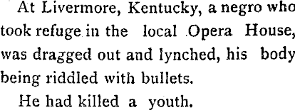 At Livermore, Kentucky, a negro who took refuge in the local Opera House, was dragged out and lynched, his body being riddled with bullets. He had killed a youth.