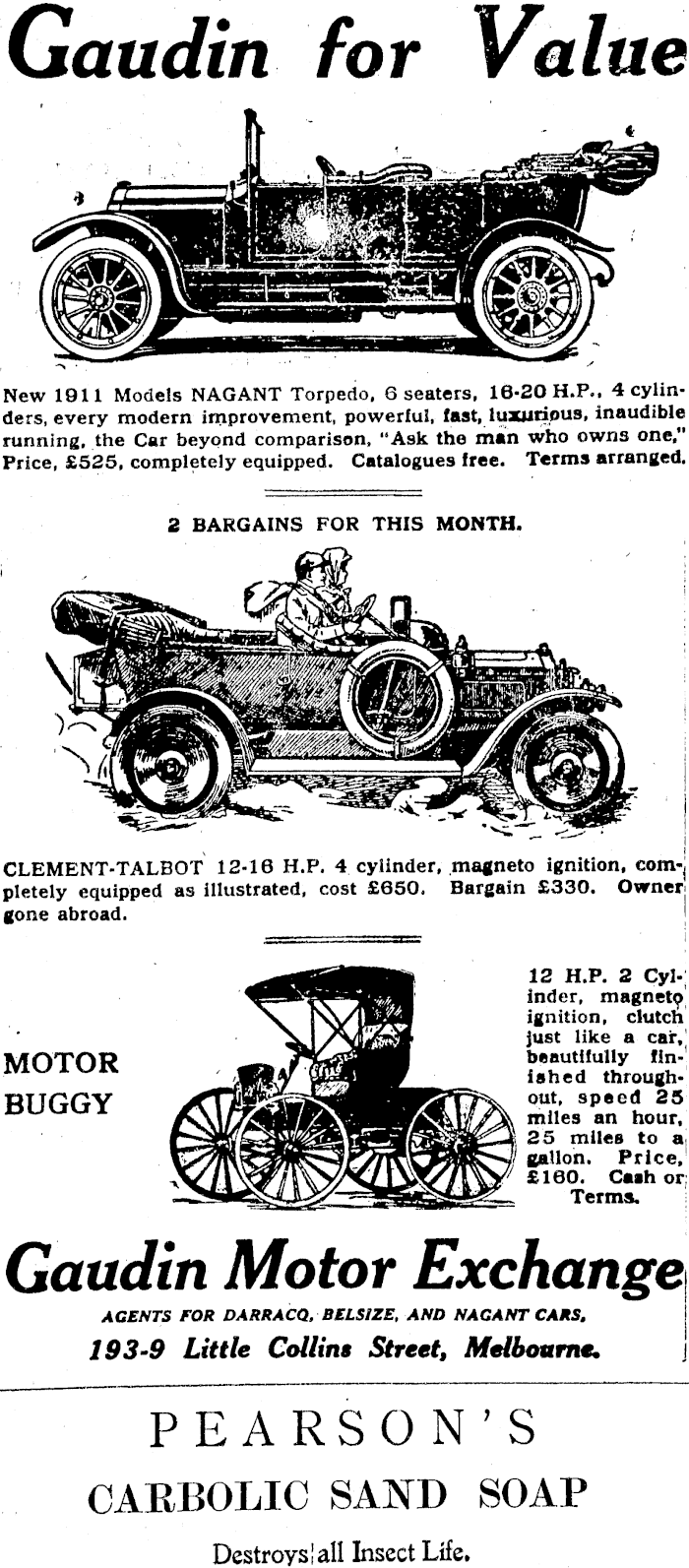 Gaudin for Value New 1911 Models NAG ANT Torpedo. 6 seaters, 16-20 H.P.. 4 cylinders, every modern improvement, powerful, fast, luxurious, inaudible running, the Car beyond comparison, "Ask the main who owns one," Price, £525, completely equipped. Catalogues free. Terms arranged. 2 BARGAINS FOR THIS MONTH. i CLEMENT-TALBOT 12-16 H.P. 4 cylinder, magneto ignition, com-j pletely equipped as illustrated, cost £650. Bargain £330. Owner gone abroad. MOTOR tfi%}tfmfKKm beautifully fin-' Gaudin Motor Exchange AGENTS FOR DARRACQ. BELSIZE, AND NAGANT CARS. 193-9 Little Collins Street, Melbourne. I ~~ PEARSON'S CAEBOLIC SAND SOAP Destroys! all Insect Life.