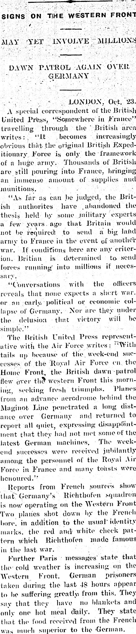 SIGNS ON TIHE WESTERN FRONT may ylt involve millions DAWN PATROL AGAIN OVER, GERMANY LONDON, Oct. 23. A special correspondent of the British United Press, “Seinewhere in France” travelling through the ' British area writes: “It becomes increasingly obvious that the original British Expeditionary Force is only the framework of a huge army. Thousands of British are still [louring into Franee, bringing an immense amount of supplies and munitions. “As far as can lie judged, the British authorites have abandoned the thesis held by some .military experts a few years ago that Britain would not be required! to send a big land army to France in the event of another war. If conditions here are any criterion. Rfitian is determined to, send forces running into millions it necessary. “Conversations with the officers reveals that none expects a short war. or an early, political or economic collapse of Germany. Nor are they under the delusion that victory will be simple.” The British United Press representative with the Air Force writes: “With tails up because ot the week-end successes of the Royal Air Force on the Home Front, the British dawn patrol Hew over th? western Front this .morning, seeking fresh triumphs. Planes from an advance aerodrome behind the Maginot- Line penetrated a long distance over Germany and returned to report all quiet, expressing disappointment that they had not met some of the latest German machines. The weekend successes were received jubilantly among the personnel ot the Royal Air Force in France and many toasts were honoured.” Reports from French sources show that Germany’s Richthofen squadron is now' operating on the Western I rout Two planes shot down by the French bore, in addition to the usual' identity marks, the red and/ white check pattern which Richthofen made famous in the last war. Further Haris messages' state that the cold weather is increasing on the Western Front. German prisoners taken during the last 48 hours appear to lie suffering greatly from this. They say that tliev have no blankets and only one hot meal diaily. They state that the food received from the French was much superior to the 'German.