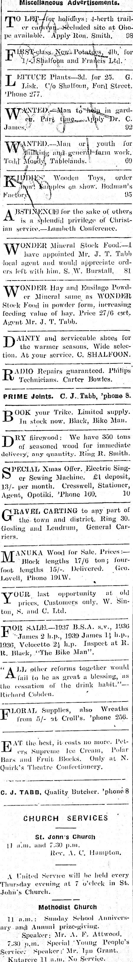 Miscellaneous Advertisements. mO hqjidhys': 1-berth trail- "*• or cadadeluded site at Ohope available. .Apply Ron. Smith. 98 41b. for J- S i.A ci JL/-C? Sbnlfofm and Francis Ltd. ' MITUCE Plants—3d. for 25. G. Li.sk. t'/o Shalloon, Ford Street. ’Phono WA^TEIX— Alan to’4lu in garden. Pilrt tjtmg w *. Ajfply'' Dr. C. James.' . £ \ 02 S^NTJOI). —.Man ori youth for teigii|g nil til gen ei’ll‘farm work. Fetid' 5f00(\4 Tablelands. 09 Wooden Toys, order dlowi Samples on .show. Hodman’s Faet'orX I Do A BSTiNtEXtIKI for the sake of other s is a splendid privilege of Christian .service.—.Lambeth Conference. WONDER .Mineral Steele Food.—L have appointed Mr. J. T. Tabb local agent and would appreciate orders left with him. S. W. Murstall. 81 WOND-lOR Hay and Ensilage Powder Mineral same as WONDER Stock Food in powder form, increasing feeding value of hay. Price 27/6 ewt. Agent Mr. J. T. Tabb. DAINTY and serviceable shoes for the warmer seasons. Wide selection. At your service. O. SHALFOON. RADIO Repairs guaranteed. Philips Technicians. Carter Bowles. PRIME Joints. C. J. Tabb, ’phone 8. BOOK your Trike. Limited supply. In stock now. Black, Bike Man. DRY fiirewood : We have 350 tons of seasoned wood for immediate delivery, any quantity. Ring R. Smith. SPECIAL Xmas Offer. Electric Singer Sewing Machine. £1 deposit, 13/- per month. Cresswell, Stationer, Agent, Opotiki. ’Phone 100. 10 GRAVEL CARTING to any part of the town and district. Ring 30. Gosling and Lcndruni, General Carriers. MANUKA Wood for Sale. Prices: — Block lengths 17/0 ton; fourfoot lengths 15/-. Delivered'. Geo. Lovell, Phono 19JW. YOUR last opportunity at old prices. Customers only. W. Hinton, S. and C. Ltd. FOR SALE.—I 937 Ji.S.A. s.v., 1930 James 2 h.p., 1930 James IJ h.p., 1030, Velocette 2£ h.p. Inspect at R. R. Black, “The Bike Man”. “ A DL other reforms together would a*-fail to be as great a blessing, as the cessation of the drink habit.”— Richard C’obden. FLORAL Supplies, also Wreaths from 5/- ut Croll’s. ’phone 250. EAT the best, it costs no more. Peters Supi'cme lee Cream, Polar . Bars and Fruit Blocks. Only at N. Quirk’s Theatre Confectionery. C. J. TABB, Quality Butcher, ’phone 8 CHURCH SERVICES St. Jonrvs Church lJ n.m. and 7.30 p.m. Rev. A. C. Hampton. A United Service will be held every Thursday evening at 7 o’cleek in St. .John's Church. Methodist Church 11 a.in. : Sunday School Anniversary andl Annual prize-giving. Speaker: Air. A. F. Attwood. 7.30 p.m. Special 'Young People’s Service: Speaker: Air. lan Grant. Kutarere 11 a.m. No Service.