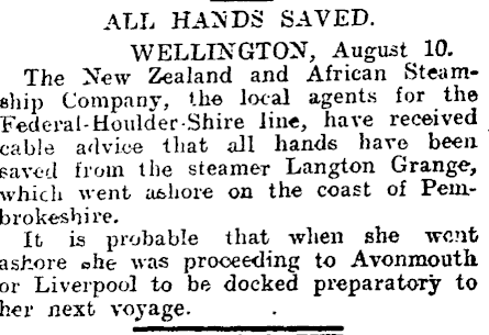 ALL HA2VDS SAVED. WELLINGTON, August 10. The New Zealand and African Steamship Company, the local agents for the Federal- Houlder Shire lin«, have received _ cable advice that all hands have been saved from the steamer Langton Grange, which went a&hore on the coast of Pembrokeshire. It is probable that when she went ashore ohe was proceeding to Avonmouth. or Liverpool to be docked preparatory to her next voyage.