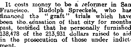 It coats money to be a /eformer in San Francieeo. Rudolph Spreckels, who has financed tha " graft " trials which have been i-ho. sensation of that city for months past, testified that he personadlv furnished 138,478 of the 213,931 dollars raised to aid in the prosecution of those under indictment.