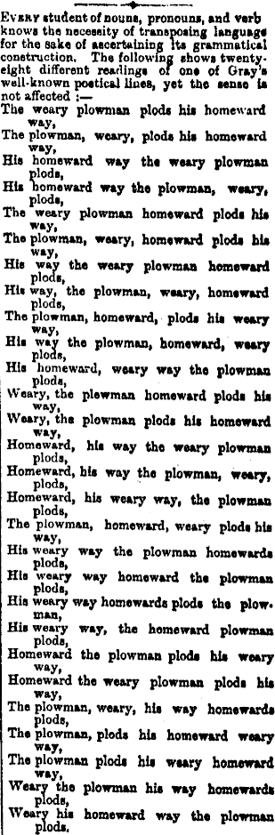 Evaar student of nouns, pronouns, and verb knows the necessity of transposing language for the sake of ascertaining Its grammatical construction. The following shows twentyeight different readings of on. of Gray’s well-known poetical lines, yet the sense is not affected :— The weary plowman plods his homeward way. The plowman, weary, plods his homeward way, His homeward way ths weary plowman plods, His homeward way the plowman, weary, plods, The weary plowman homeward plods his way, The plowman, weary, homeward plods bis way, His way the weary plowman homeward plods, His way, the plowman, weary, homeward plods, The plowman, homeward, plods bis weary way, Hi« the plowman, homeward, weary His homeward, weary way the plowman plods, Weary, the plowman homeward plods his way, Weary, the plowman plods his homeward way, Homeward, his way the weary plowman plods, Homeward, his way the plowman, weary, plods, * Homeward, his weary way, the plowman plods, The plowman, homeward, weary plods his way, His weary way the plowman homewards plods, His weary way homeward the plowman plods, His weary way homewards plods the plow, man, His weary way, the homeward plowman plods, Homeward the plowman plods hie weary „ wa y,, , Homeward the weary plowman plods hie way, The plowman, weary, his way homeward! plods, The plowman, plods his homeward weary way, The plowman plods his weary homeward way, 1 * owm * n 8 homewards homeward way the plowman