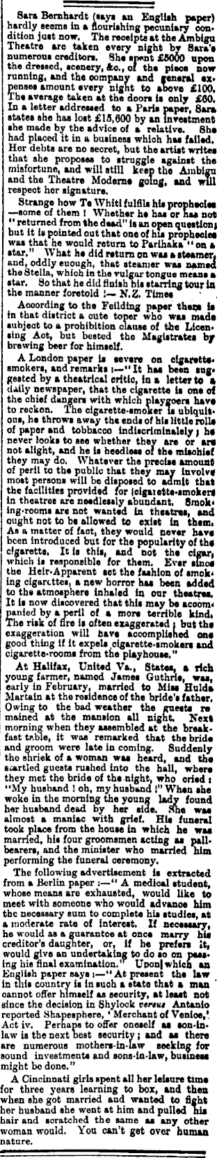 Sara Bernhardt (says an English paper) hardly seems in a flourishing pecuniary condition just now. The receipts at the Ambigu Theatre are taken every night by Sara’s numerous creditors. She spent £5OOO upon the dressed, scenery, Ac., of the piece now running, and the company and general expenses amount every night to above £lOO. The average taken at the doors is only £6O. In a letter addressed to a Paris paper, Sara states she has lost £15,600 by an investment she made by the advice of a relative. She had placed it in a business which has failed. Her debts are no secret, but the artist writes that she proposes to struggle against the misfortune, and will still keep the Ambigu and the Theatre Moderns going, and will respect her signature. Strange how Te Whiti fulfils his prophecies —some of them I Whether he has or has not '' returned from the dead" is an open question; but it is pointed out that one of his prophecies was that he would return to Parihaka “on a star." What he did return on was a steamer, and, oddly euough, that steamer was named the Stella, which in the vulgar tongue means a star. So that he did finish nis starring tour in the manner foretold !— N.Z. Times According to the Feilding paper these ie in that district a cute toper who was made subject to a prohibition clause of the Licensing Act, but bested the Magistrates by brewing beer for himself. A London paper is severe on cigarettesmokers, and remarks I—" It has been eng* gested by a theatrical critic, in a letter to a daily newspaper, that the cigarette is one of the chief dangers with which playgoers have to reckon. The cigarette-smoker is übiquitous, he throws away the ends of his little rolls of paper and tobbacco indiscriminately ; he never looks to see whether they are or are not alight, and he is heedless or the mischief they may do. Whatever the precise amount of peril to the public that they may involve moat persons will be disposed to admit that the facilities provided for loigatette-smokers in theatres are needlessly abundant. Smok-ing-rooms are not wanted in theatres, and ought not to be allowed to exist in them. As a matter of fact, they would never have been introduced but for the popularity of the cigarette, It is this, and not the cigar, which is responsible for them. Ever since the Heir-Apparent set the fashion of smoking cigarettes, a new horror has been added to the atmosphere inhaled in our theatres. It is now discovered that this may be accompanied by a peril of a more terrible kind. The risk of fire is often exaggerated i but the exaggeration will have accomplished one good thing if it expels cigarette-smokers and cigarette-rooms from the playhouse." At Halifax, United Va., States, a rich young farmer, named James Guthrie, was, early in February, married to Miss Hulda Martain at the residence of the bride's father. Owing to the bad weather the guests re mained at the mansion all night. Next morning when they assembled at the breakfast table, it was remarked that the bride and groom were late in coming. Suddenly the shriek of a woman was heard, and the startled guests rushed into the hall, where they met the bride of the night, who cried : “My husband ! oh, my husband 1" When she woke in the morning the young lady found her husband dead by her aide. f(he was almost a maniac with grief. His funeral took place from the house in which he was married, his four groomsmen acting as pallbearers, and the minister who married him performing the funeral ceremony. The following advertisement is extracted from a Berlin paper : —“ A medical student, whose means are exhausted, would like to meet with someone who would advance Mm the necessary sum to complete his studies, at a moderate rate of interest. If necessary, he would as a guarantee at once marry his creditor's daughter, or, if he prefers it, would give an undertaking to do so on passing his final examination. ' r Uponj which an English paper says At present ths law in tills country is in such a state that a man cannot offer himself as security, at least not since the decision in Shylock cercus Antanio reported Shapesphere, ‘ Merchant of Venice,' Act iv. Perhaps to offer oneself as son-in-law is the next best security; and as there are numerous mothers-in-law seeking for sound investments and sons-in-law, business might be done. ” A Cincinnati girls spent all her leisure tune for three years learning to box, and then when she got married and wanted to fight her husband she went at him and pulled his hair and scratched the same as any other woman would. You can’t get over human nature.