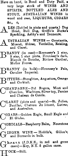 Have on hand, in Bond and Duty Paid, a very large stock of WINES AND SPIRITS, BOTTLED ALES AND STOUT, AUSTRALIAN WINES in wood and case, LIQUEURS, CIGARS &c., c, ALES (Bottled in pints and quarts.) Dog Head, Bull Dog, Griffin’s Burke’s Sparkling, Ashby’s and Tennente. Australian wines — Constantia, Muscat, Shiraz, Verdeilho, Brisling, and Claret. BRANDY (in case) —Hennessy’s 1 star, 3 star, 1 star pints, Hennessy’s dark, Bisquit de Bouche, Riviere Gardrat, Muller Frcres. BRANDY (in bulk)—Hennessy’s Pale, Cavalier Imperial, BITTERS— Stougliton, Anguatura, Orange and Cocktail. CHAMPAGNE— Pol Rogers, Moot and Cbandon, Wachters, Silver top, Perrier and Chateau de Conde. CLARET (pints and quarts)—St. Julien, Pauillac, Chateau Jo limont, Listrac, and Australian. CIGARS— Golden Eagle, Small Eagle and El Globo. OORDIALS— Raspberry Balm, Neurotone GINGER WINE — Heddlo’a, Gillon’e, and Bernards in bulk. (J.D.K.Z., in red and green cases)—Key, N.Y. 5 gallon cases. JJOCK— Still.