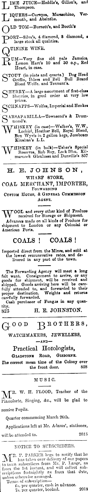 LIME JUlCE— Heddle’s, Gillon’s, and Thompson. LIQUERS— Cutugoa, Maraschino, Vermouth, and Absinthe. TOM—Burnett’s, and Booth’s PORT —Silva’s, 4 diamond, 3 diamond, a large stock all qualities. QUININE WINE. RUM— Very fine old pale Jamaica, Lemon Hart’s 10 and 30 0.p., Red Heart, in case. STOUT (in pints and quarts.) Dog Head Griffin, Ihlers and Bell Bull Brand Blood Wolfe, and Tennant’s. SHERRY —A large assortment of first-class Sheiries, in good order at very low prices. gCHN APRS—Wolfes, Imperial and Henkes SARSAPARILLA— Townsend’s & Drummond’s. WHISKEY (in ease)—Walker’s, W.W., Lochiel, Heather 8011, Royal Blend, Ben Wyvis in 2 gallon kegs, Jcreboam Kinahan’s L.L. WHISKEY (in bulk)—Usher’s Special Reserves, Rob Roy, Look Dhu, Kilmarnock Glenlussa and Dunville’s 857 H. E. JOHNSON, WHARF STORE, COAL MERCHANT, IMPOBTER, Fouwaeding Custom House, & General Commission Agent. WOOL and every other kind of Produce received for Storage or Shipment. Advances made on all kinds of Produce for shipment to London or any Colonial or American Porta. COALS ! COALS! Imported direct from the Mines, and sold at tlio lowest remunerative rates, and delivered in any part of the town. The Forwarding Agency will meet a long felt want. Consignment to arrive, or any goods for shipment, will bo received and shipped. Goods arriving hero will be carefully attended to, and forwarded to their proper destination. Weights and returns carefully forwarded. Cash purchaser of Fungus in any quantity. 825 H. E. JOHNSTON. Q.OOD JgHOTIIERS, WATCHMAKERS, JEWELLERS, —AND — Practical Hoiologists, Gladstone Road, Gisborne. The correct mean time of the Colony over the front door. 828 MUSIC. W. H. FLOOD, Teacher of the Pianoforte, Singing, &c., will be glad to receive Pupils. Quarter commencing March 26th. Applications left at Mr. Adams’, stationer, will be attended to. 2015 NOTICE TO SUBSCRIBERS. MR. F. PARKER begs to notify that he has taken over delivery of our papers to town subscribers from Mr. P. Lange, as from the Ist instant, and will collect subscriptions fortnightly as from that date, unless otherwise arranged. Terms of subscription—6s. per quarter, cash in advance. 7s. per quarter, booked. 2018